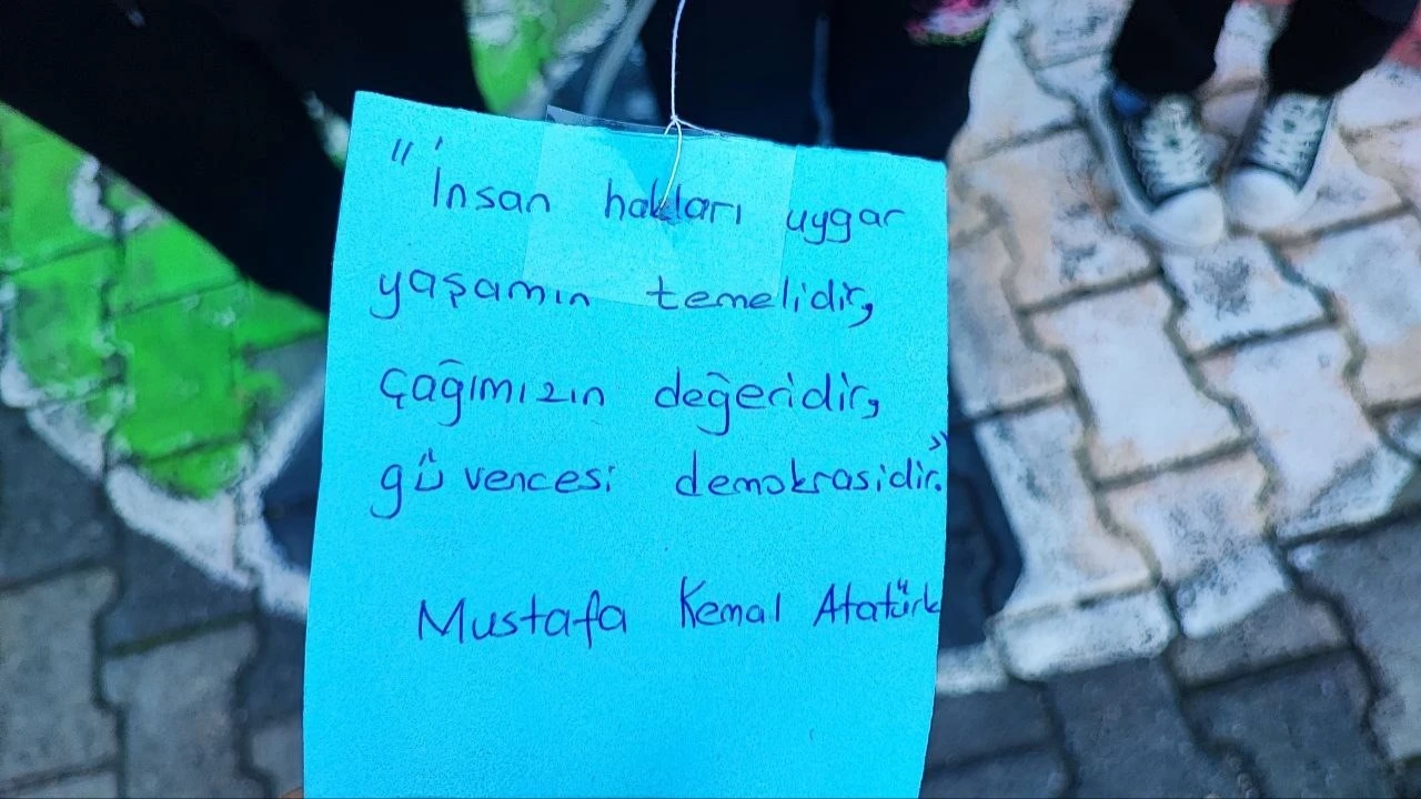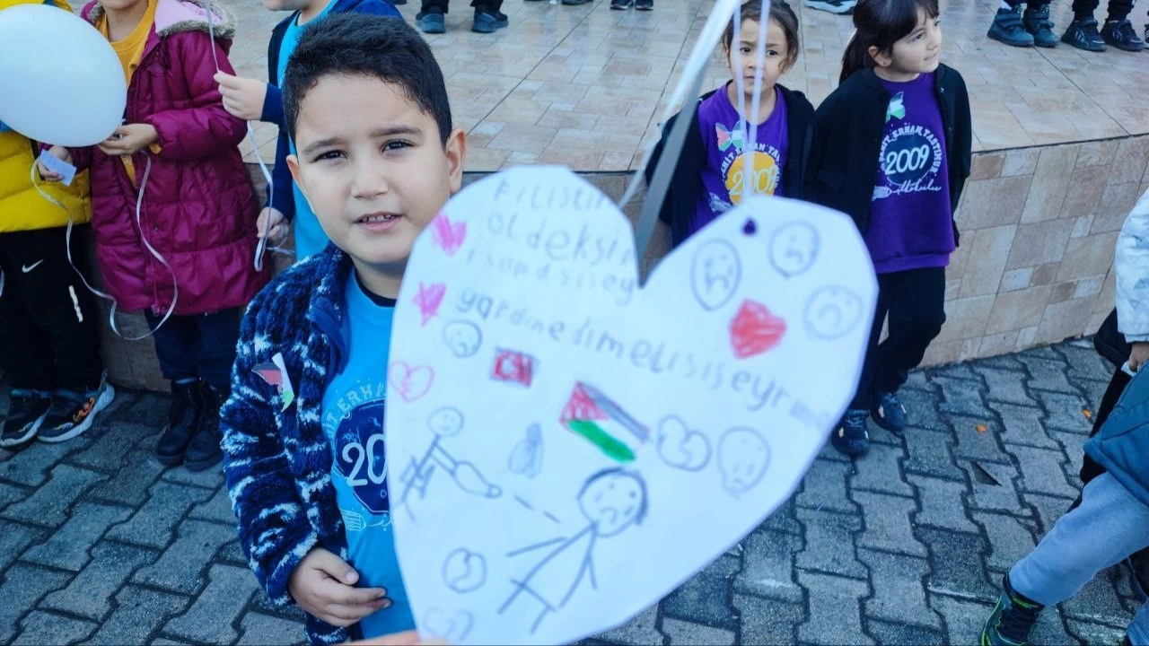 Öğrencilerden Melek Akdağ, "İnsanların haklarıyla ilgili balonları havaya atacağız. Çok mutluyum. Filistin’deki çocukların hakları için balonları atacağız" derken Zeynep Coşkun, balona iliştirdiği nota, "Yaşama hakkı en temel haktır" yazdığını söyledi.
