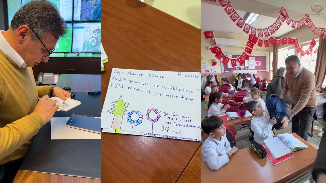 İskenderun ilçesinde bulunan 5 Temmuz İlkokulu 3-E sınıfı öğrencileri, Belediye Başkanı Mehmet Dönmez’in yeni yılını kutlamak için yeni yıl mesajlarının bulunduğu kartlar hazırladı. Çocukların yürek ısıtan mesajlarına kayıtsız kalmayan başkan Dönmez, öğrencileri okullarında ziyaret etti.
