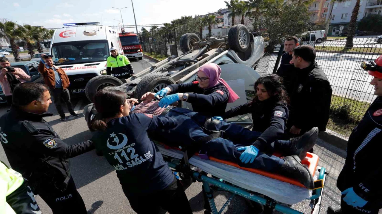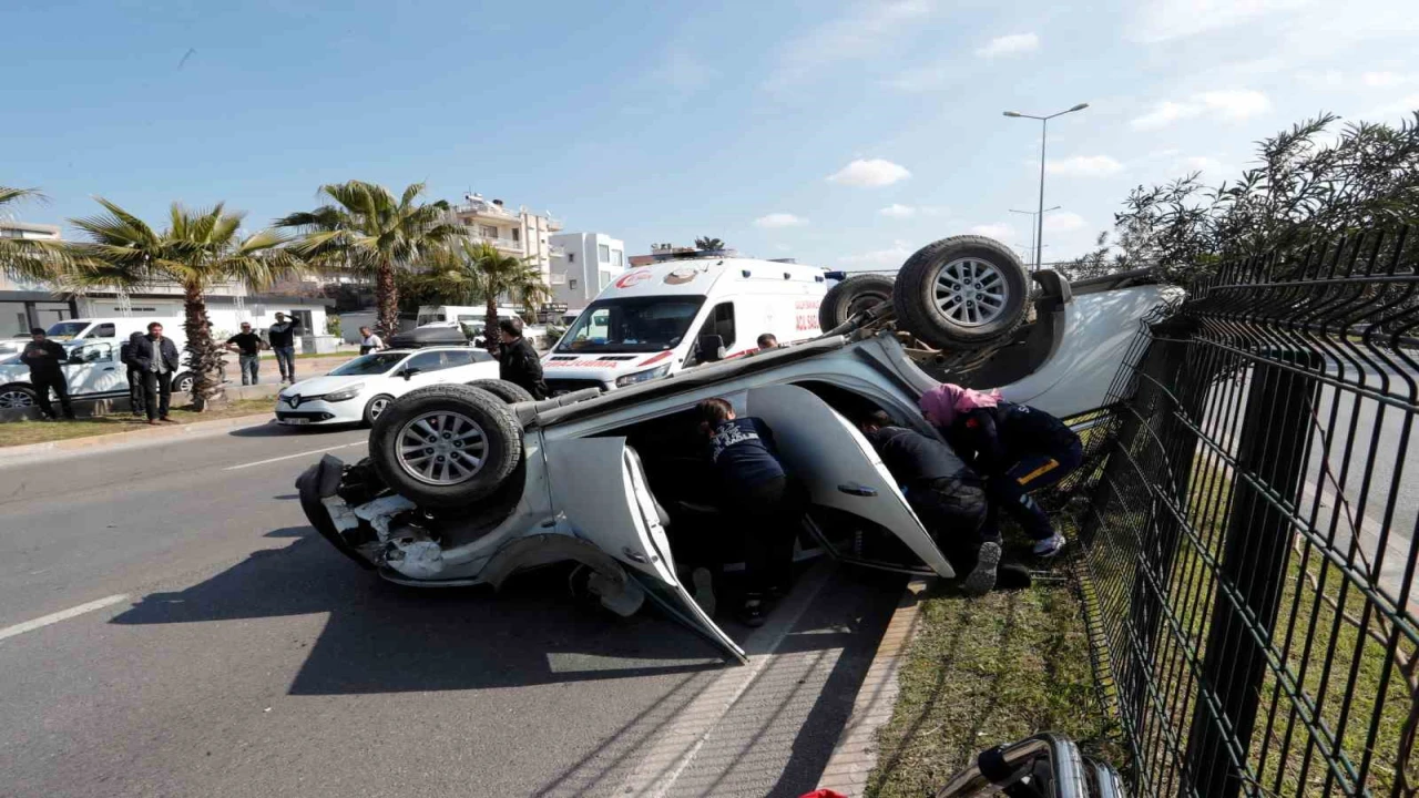 Antalya’da direksiyon hakimiyetini kaybeden sürücü yol kenarındaki palmiyelere çarparak takla attı. Araçta sıkışan sürücüyü itfaiye ve sağlık ekipleri bulunduğu yerden çıkardı.
