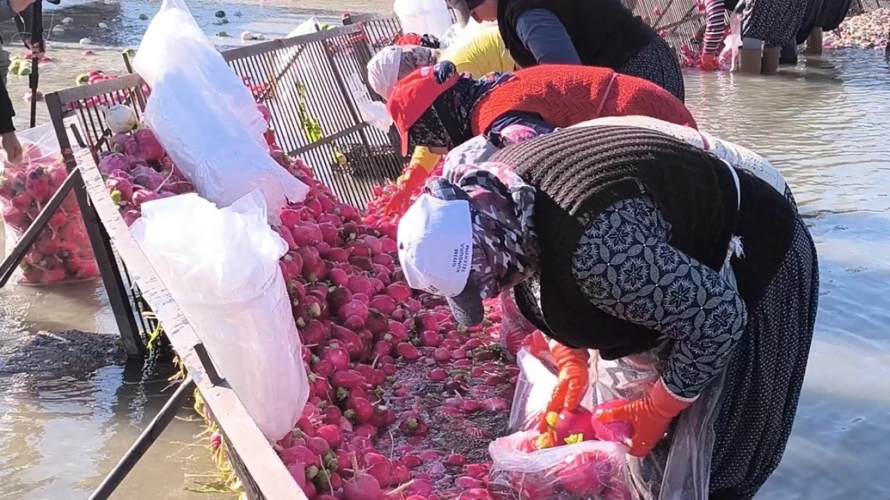 Osmaniye’nin Kadirli ilçesinde turp hasadıyla birlikte kadınların zorlu mesaisi devam ediyor. Tarladan gelen turplar, soğuk kış şartlarında yıkanarak torbalanıyor, ardından yurdun dört bir yanına gönderiliyor.