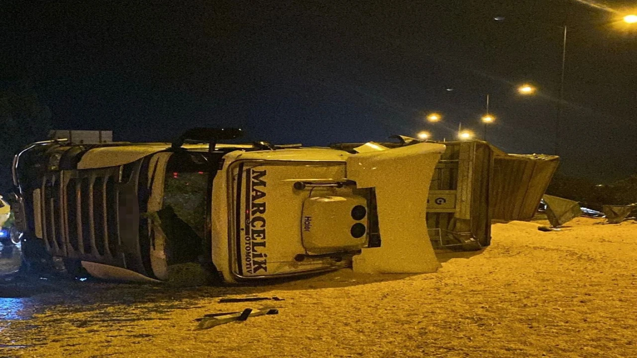 Osmaniye’nin Bahçe ilçesinde, yağmur nedeniyle kayganlaşan yolda kontrolden çıkan mısır yüklü kamyon yan yattı. Kazada kamyon sürücüsü yaralandı.