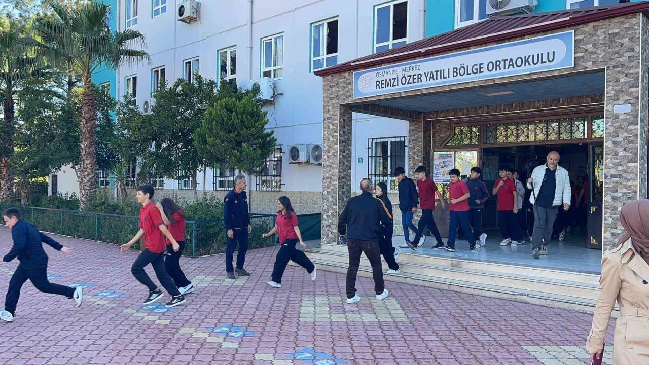 Osmaniye Yıldırım Beyazıt Mahallesi’nde bulunan Remzi Özer Yatılı Bölge Ortaokulu’nda gerçekleştirilen tatbikatta, sirenin çalmasıyla birlikte öğrenciler önce sıralarının altına girdi, ardından öğretmenlerinin yönlendirmesiyle okul bahçesine tahliye edildi. Bahçede toplanan öğrencilere, Osmaniye Belediyesi İtfaiye Müdürlüğü ekipleri tarafından yangın anında yapılması gerekenler hakkında bilgi verildi.