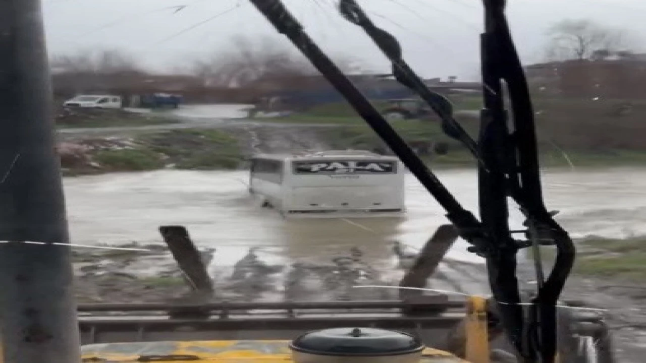 Osmaniye’nin Toprakkale ilçesinde sağanak yağış nedenyle birçok noktada taşkınlar meydana gelirken, debisi yükselen derede bir işçi servisi mahsur kaldı.