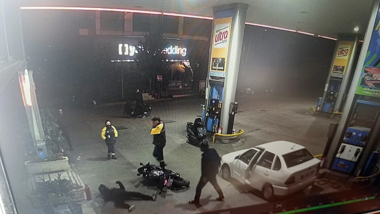 Akaryakıt istasyonunda otomobil sürücüsünün inmek için açtığı aracının kapısına çarpan motosiklet sürücüsü yaralandı. Kaza anları güvenlik kamerasına yansıdı.