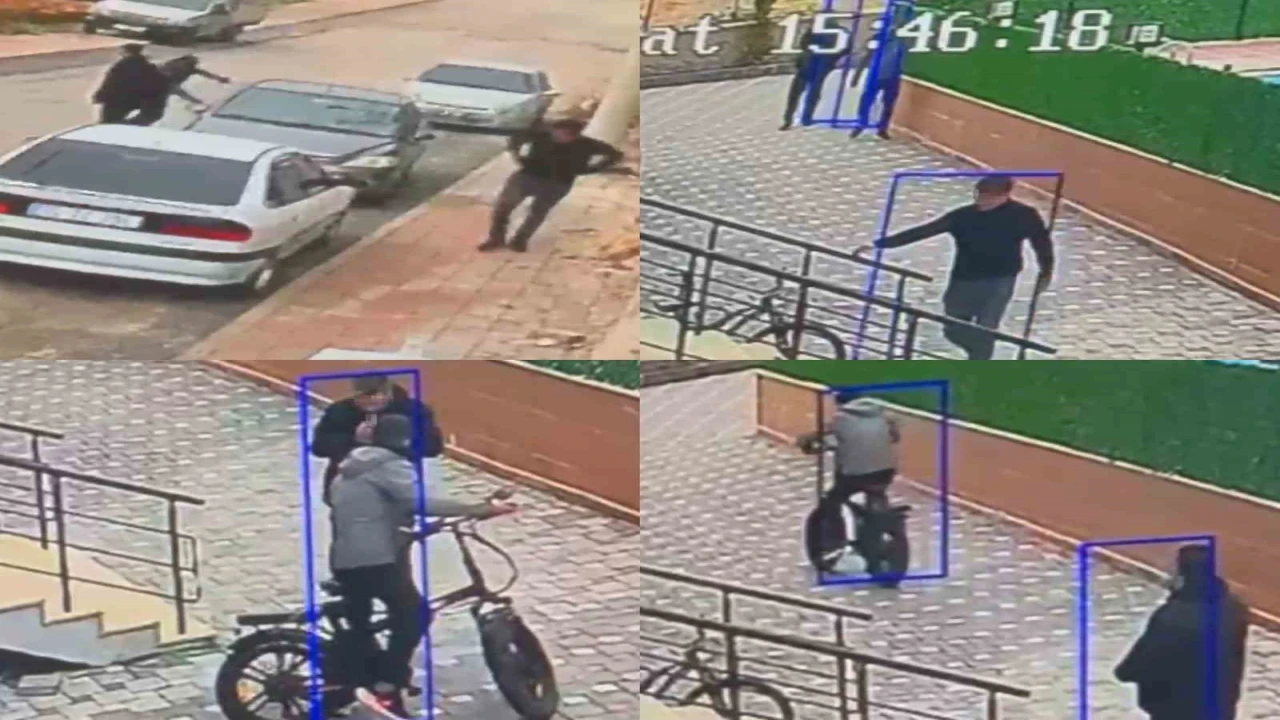 Görüntülerde, otomobille gelen 3 kişinin siteye girmesi, birinin binaya yönelmesi, diğerinin elektrikli bisikleti çalması, üçüncü şahsın da çevreyi kontrol ederek hareket etmesi yer aldı.