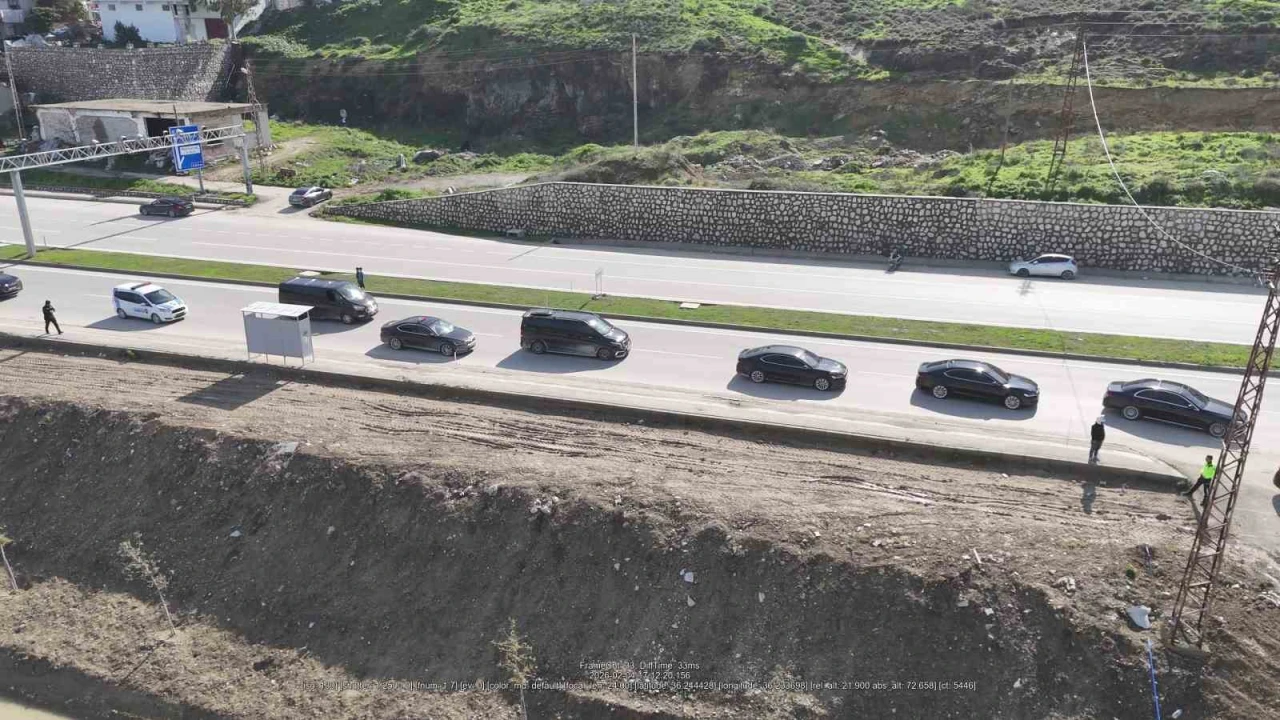 Hatay’da deprem mezarlığını ziyaret eden CHP Genel Başkanı Özgür Özel’in 30 araçlık konvoyu havadan görüntülendi.