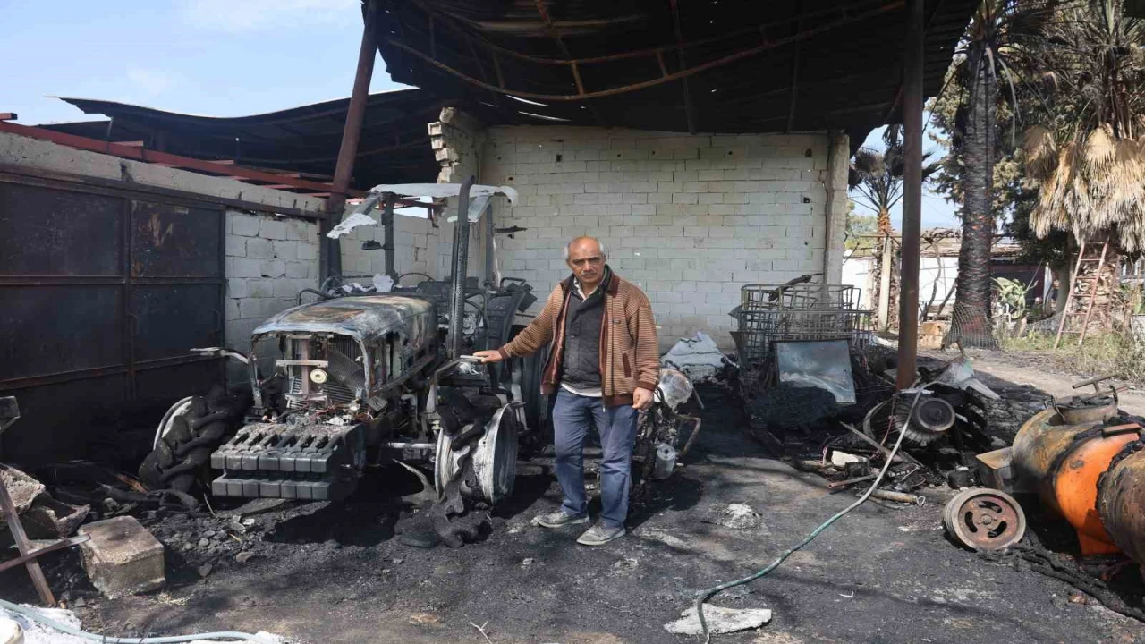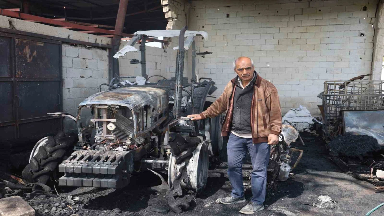 HATAY’DA ALEVLERE TESLİM OLAN GARAJDAKİ 1 TRAKTÖR, 3 MOTOSİKLET VE TARIM ALETLERİ KULLANILMAZ HALE GELDİ. YANGIN ANINDA YAŞANANLARI ANLATAN GALİP GÜNEY, TRAKTÖRÜN TEKERİNİN PATLAMASIYLA YANGINI FARK ETTİKLERİNİ SÖYLEDİ.