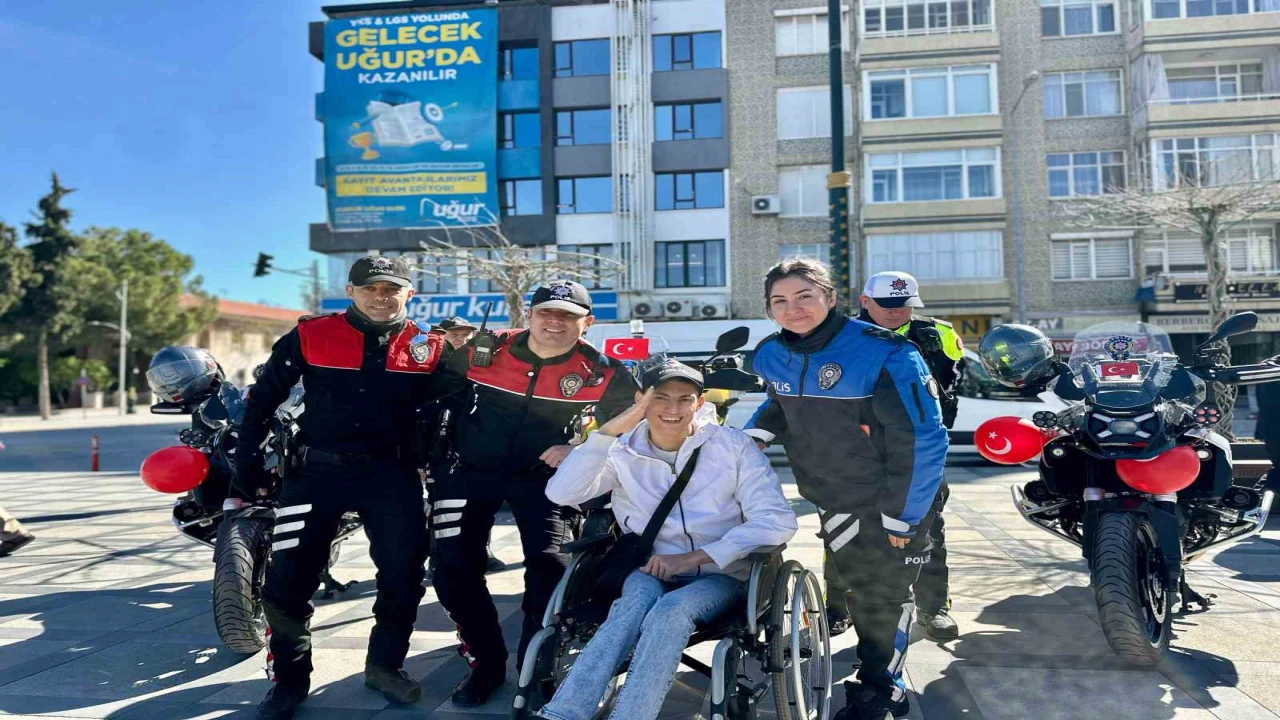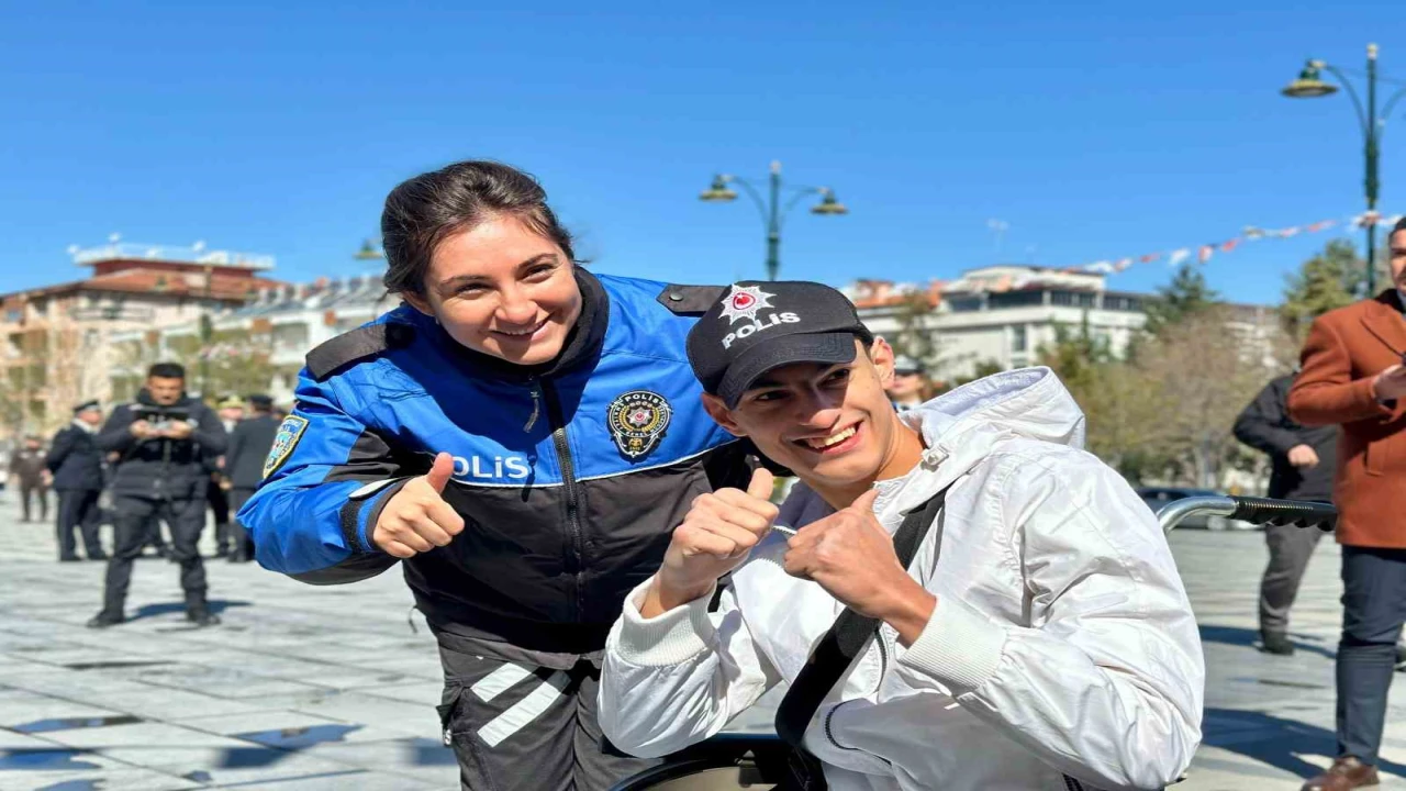 Konvoyun en anlamlı anı ise 23 yaşındaki serebral palsi hastası Cem Özen’in katılımı oldu. Türk bayrakları ve balonlarla süslenen emniyet aracına polisler eşliğinde bindirilen Cem, siren sesleri eşliğinde şehir turuna çıktı. Mutluluğu gözlerinden okunan genç, polislerin yanında olmaktan büyük sevinç duydu. Cem’in yüzündeki tebessüm törene katılan herkese duygusal anlar yaşattı.