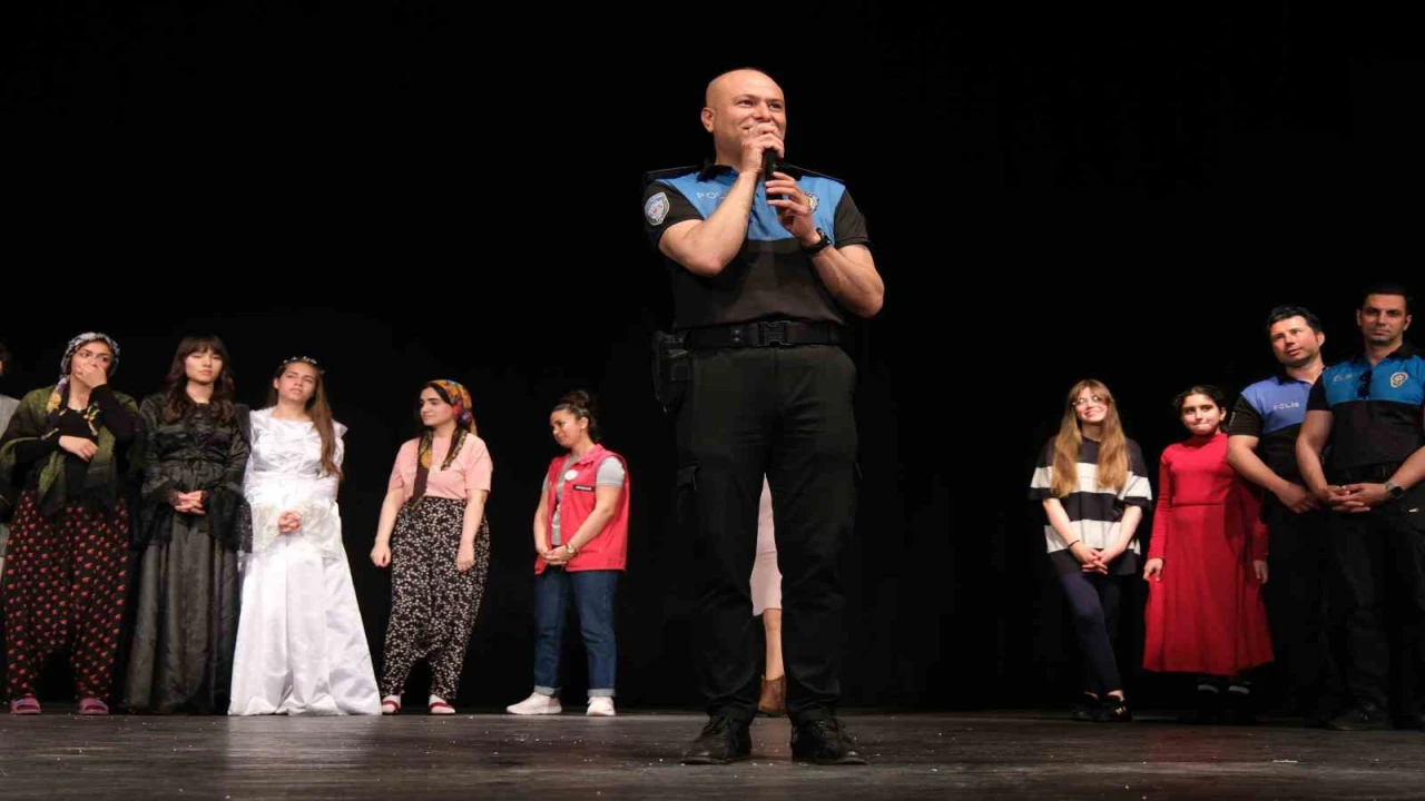 Adana’da sahnelenen "Bir Kadının Rüyası" tiyatro oyununda öğrencilerle birlikte bir polis de sahne aldı.