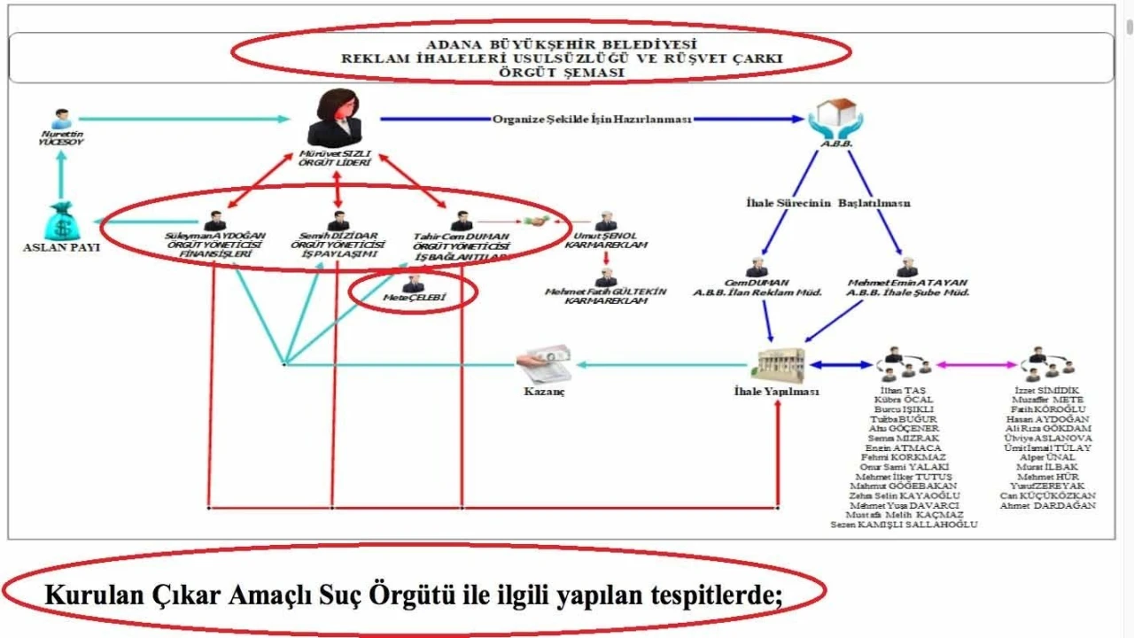 İddiaya göre, reklam ihalelerinin şartnamesini sızdıran ve daha sonra CHP Adana İl 2. Başkanlığı görevine getirilen Mete Çelebi ile firmalar arasındaki para trafiği, Adana Emniyet Müdürlüğü KOM Şube tarafından hazırlanan 878 sayfalık fezlekede yerini aldı. Fezlekede, Mete Çelebi’nin Adana Büyükşehir Belediyesi’ne yüklü miktarlarda fatura kesen Cem Tahir Oğulhan’ın sahibi olduğu Eylül Ajans’ta sigortalı çalışıyormuş gibi gösterildiği de polis tarafından belgelendi. Çelebi’nin ihale şartnamelerini Semih Dizidar’ın sahibi olduğu Paragraf Ajans’a, Süleyman Aydoğan ve kardeşlerinin ortağı olduğu Aydoğan Ahşap ve Reklam şirketi ile Tahir Cem Oğulhan’la birlikte hazırladıkları, bu şartnamelerle belediyenin zarara uğratıldığı öne sürüldü.