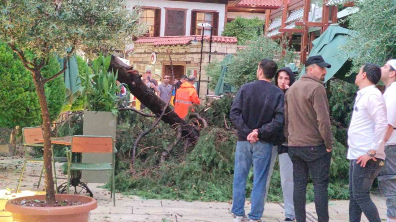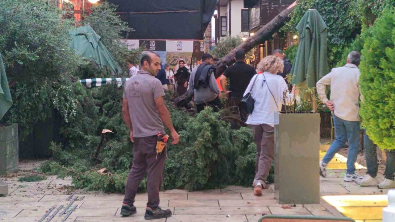 Kaleiçi bölgesi Barbaros Mahallesi Hesapçı Sokak’ta ise şiddetli rüzgar sonucu bir ağaç devrildi. Bu sırada kafede oturan 3 kişi, ağacın altında kalarak yaralandı. Kimliği belirlenemeylen 2’si hafif yaralı 3 kişi çevredeki vatandaşlar tarafından ağacın altından çıkartılırken, ihbarla birlikte olay yerine itfaiye, polis ve sağlık ekipleri sevk edildi. Sağlık ekipleri yaralıları ambulansla hastaneye götürüldü. İtfaiye ekipleri devrilen ağacın kaldırılması için çalışma başlattı.