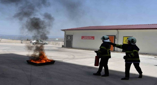 İtfaiye ekipleri tarafından hastane bahçesinde yapılan tatbikatta yanan bir cisme yangın söndürme tüpü ile nasıl müdahale edileceği önce itfaiye ekipleri tarafından gösterilirken, daha sonra hastane personeli tarafından da tekrar edildi.
