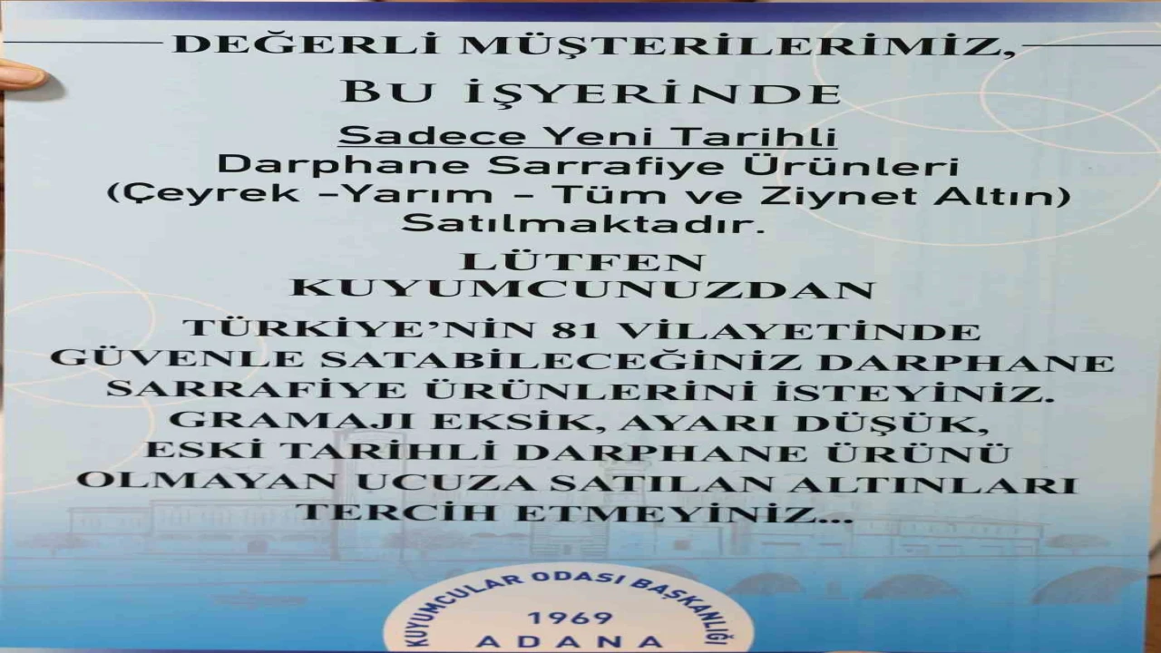 Yurt genelinde son dönemlerde sahte veya ayarı düşük altın satışlarının artması üzerine yaşanan mağduriyetlerin önüne geçebilmek için Adana’da kuyumcular iş yerlerine ’Bu iş yerinde sadece yeni tarihli darphane sarrafiye ürünleri satılmaktadır’ yazılı dövizler astı. Uygulamayla birlikte artık kuyumcularda sadece yeni tarihli darphane çeyrek, yarım ve tüm altın satabileceği bildirildi. Müşterilerin sattığı altınlar kesilip, eritmeye yollanırken uygulamadan hem esnaf hem de vatandaşlar memnun oldu.