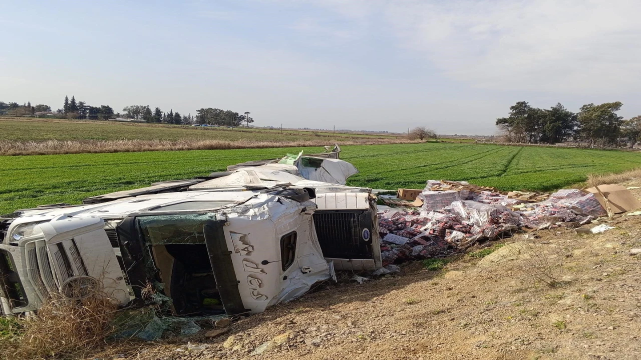 HATAY (İHA) - Hatay’da şarampole devrilen enerji içeceği yüklü tırın sürücüsü yaralandı.