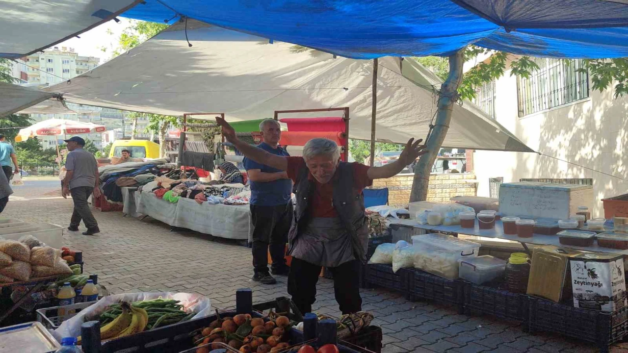 Kahramanmaraş’ın Onikişubat ilçesindeki pazarın renkli siması, hem ekmeğini kazanıyor hem de şarkı söyleyip oynayarak herkese neşe saçıyor.