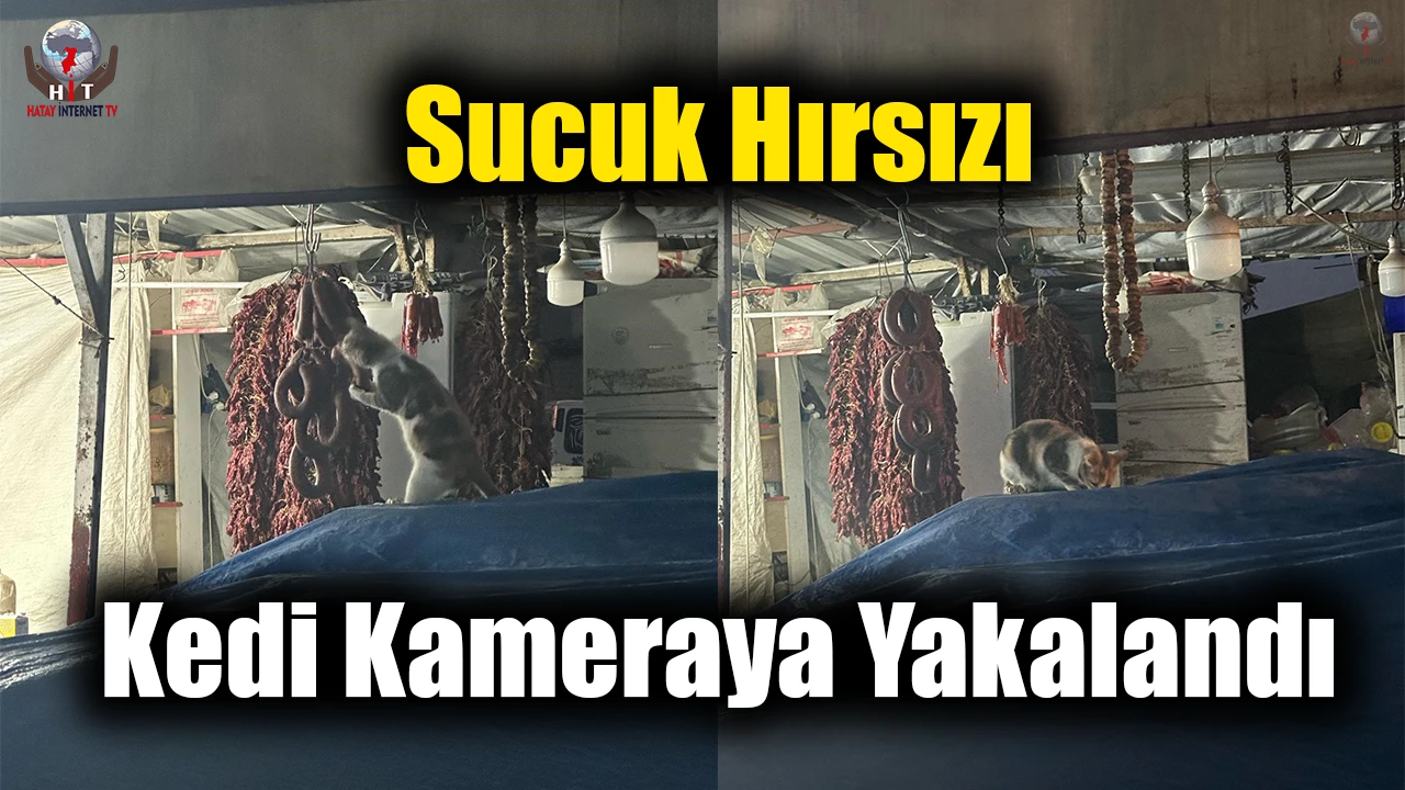 HATAY (İHA) - Hatay’da semt pazarında bulunan şarküteri tezgahında sucuk yiyen kedi kameraya yansıdı.