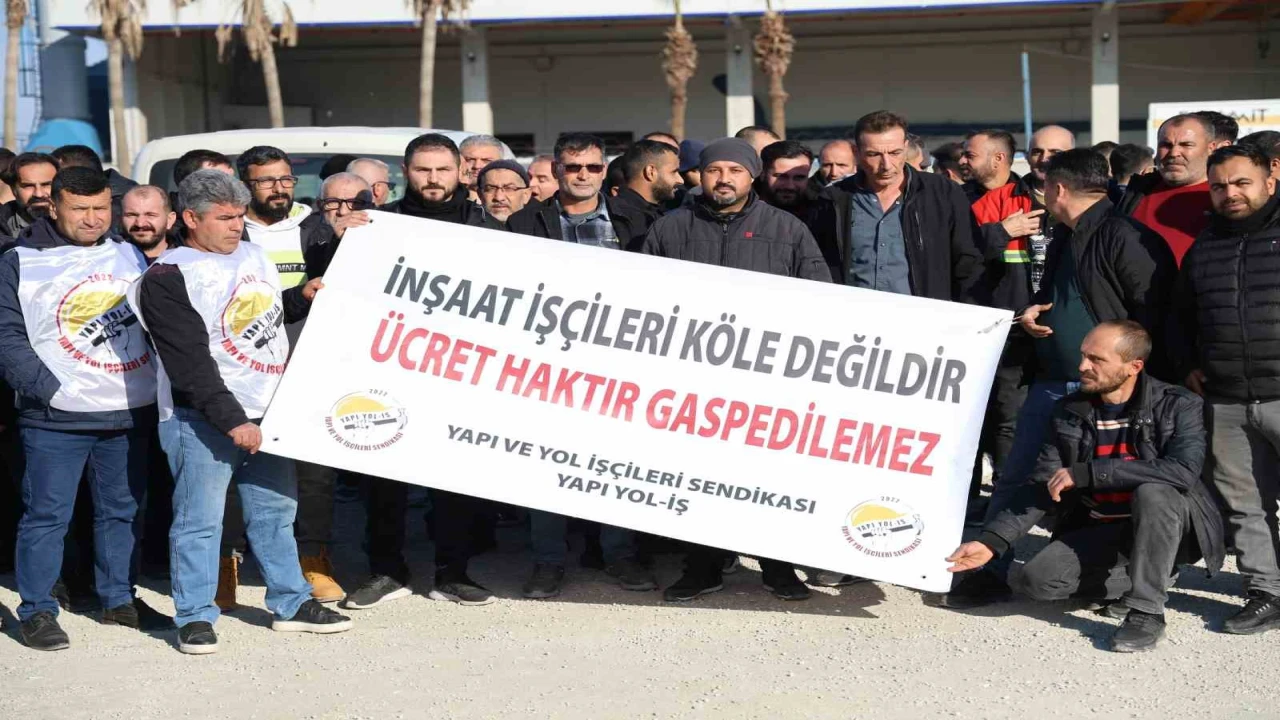 Fabrika yetkilileriyle görüşme talebinde bulunan işçiler, olumlu yanıt alamayınca ’İnşaat işçileri köle değildir, ücret haktır gasp edilemez’ yazılı pankartla sloganlar attı.