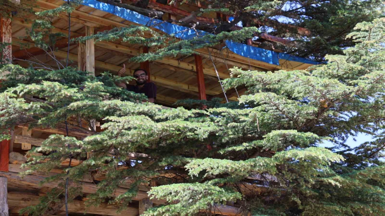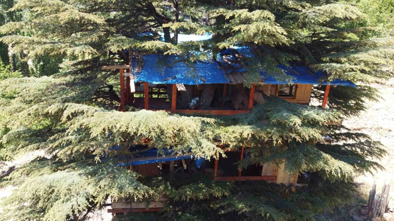 Sedir ağacı ve dalları arasına özenle hazırlanan iki katlı ev havadan görüntülendi.