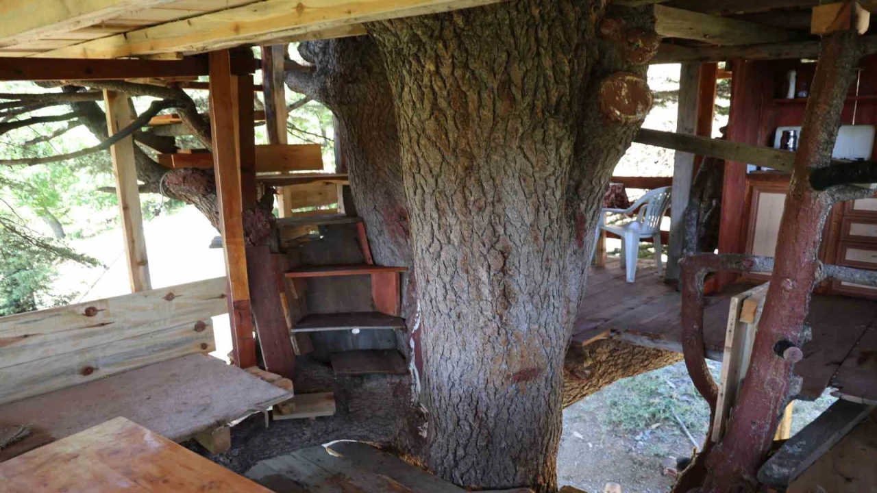 Adana’nın Saimbeyli ilçesinde yaşayan Bayram ailesi, bahçelerinde bulunan asırlık sedir ağacına tek bir çivi dahi çakmadan 2 katlı bir ağaç ev inşa etti.