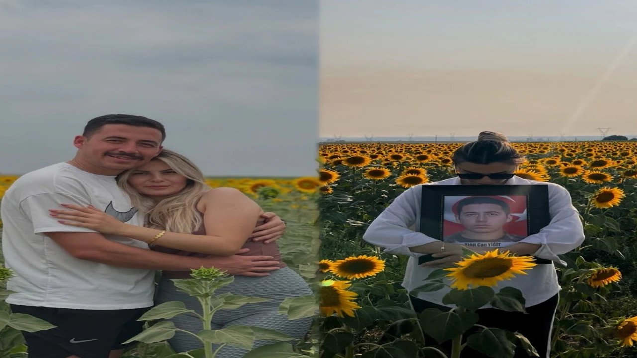 TUNCELİ'DE KAZADA ŞEHİT OLAN POLİS MEMURU YİĞİT CAN YİĞİT'İN EŞİ İLKNUR YİĞİT, ONUNLA BİRLİKTE FOTOĞRAF ÇEKTİRDİĞİ AYÇİÇEK TARLASINA GİDİP KUCAĞINDA ŞEHİT EŞİNİN FOTOĞRAFI İLE ÇEKİM YAPMASI DUYGULANDIRDI.
