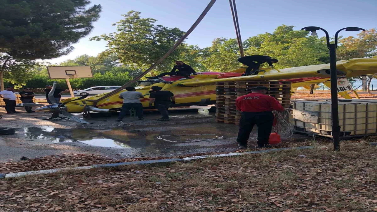 Adana’da baraj gölüne düşen yangın söndürme uçağının enkazı sudan çıkarılıp kıyıya çekildi.