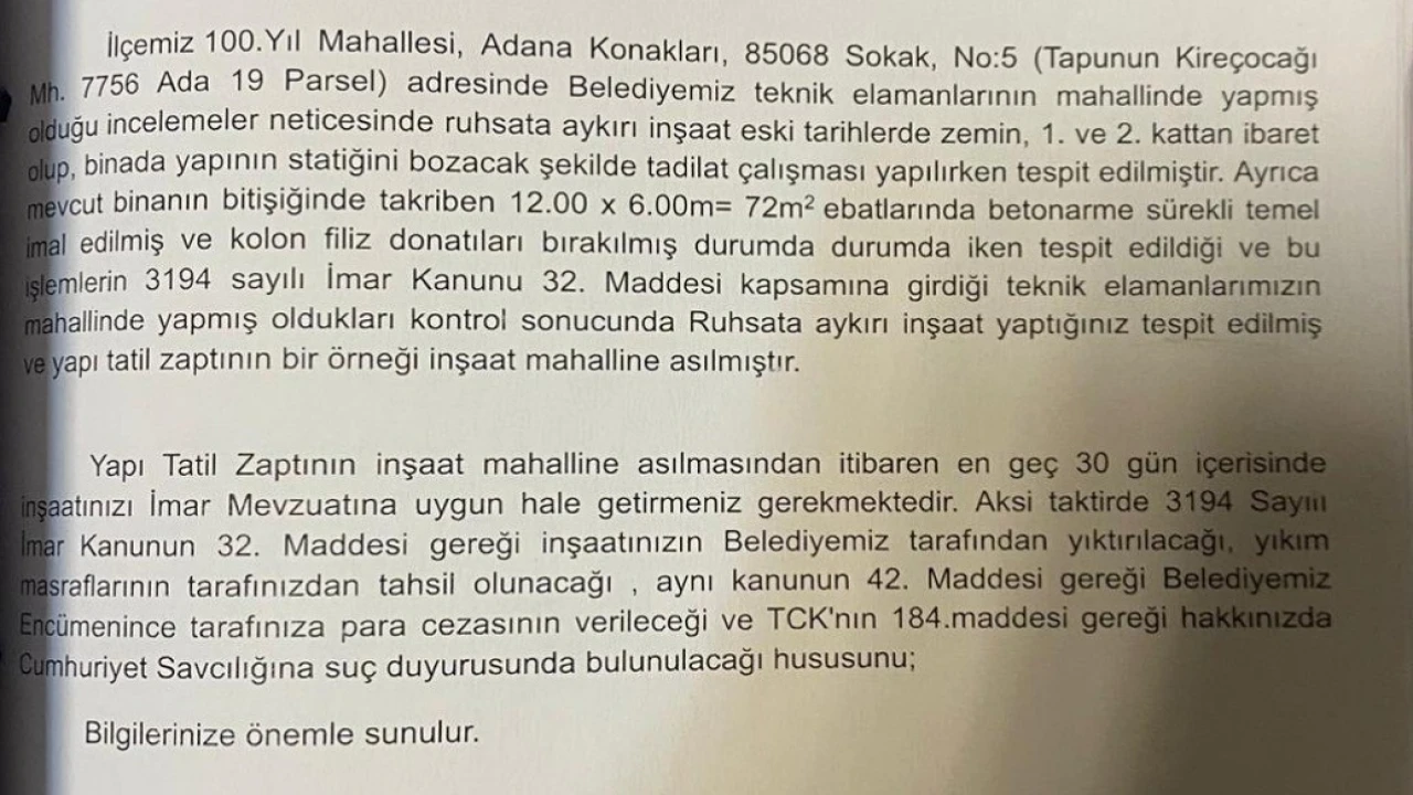 Belediye tarafından yapılan resmi tebligatta inşaatın 30 gün içinde mevzuata uygun hale getirilmemesi halinde yıkılacağı, yıkım masraflarının ilgilisinden tahsil edileceği, İmar Kanunu’nun 42. maddesi gereği para cezası uygulanacağını ve TCK 184. madde kapsamında Cumhuriyet Savcılığı’na suç duyurusunda bulunulacağı bildirildi.
