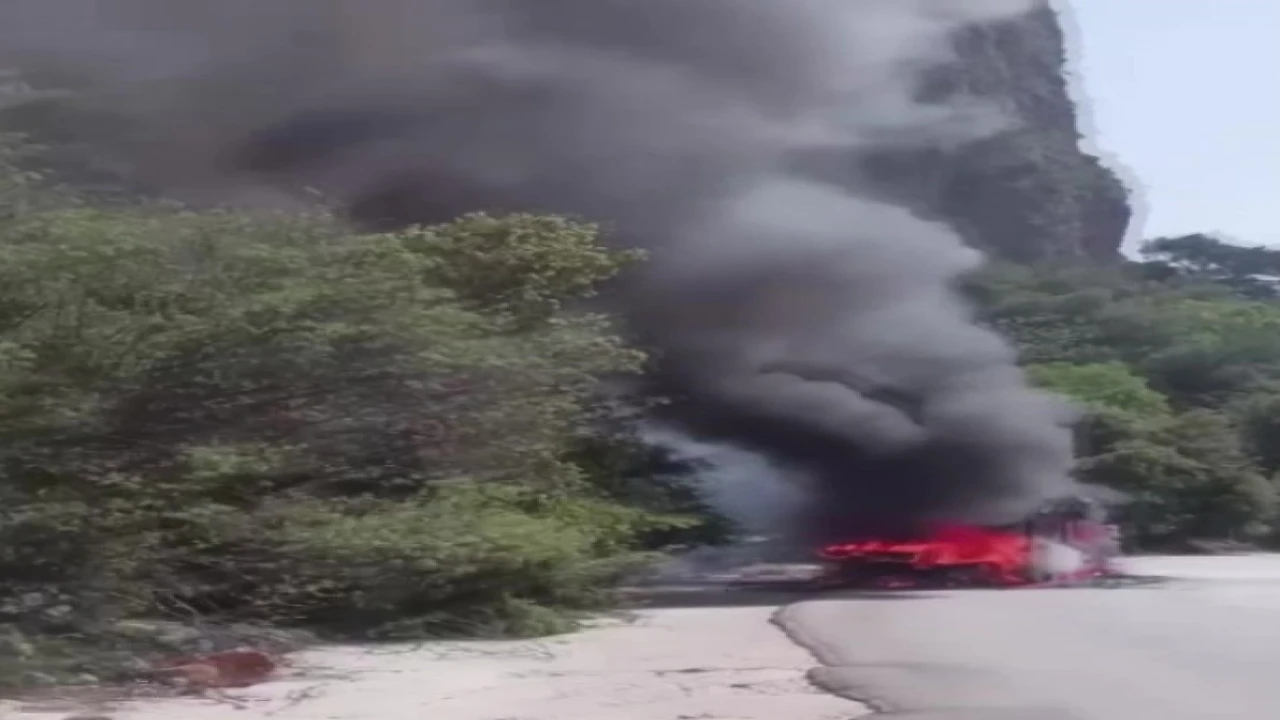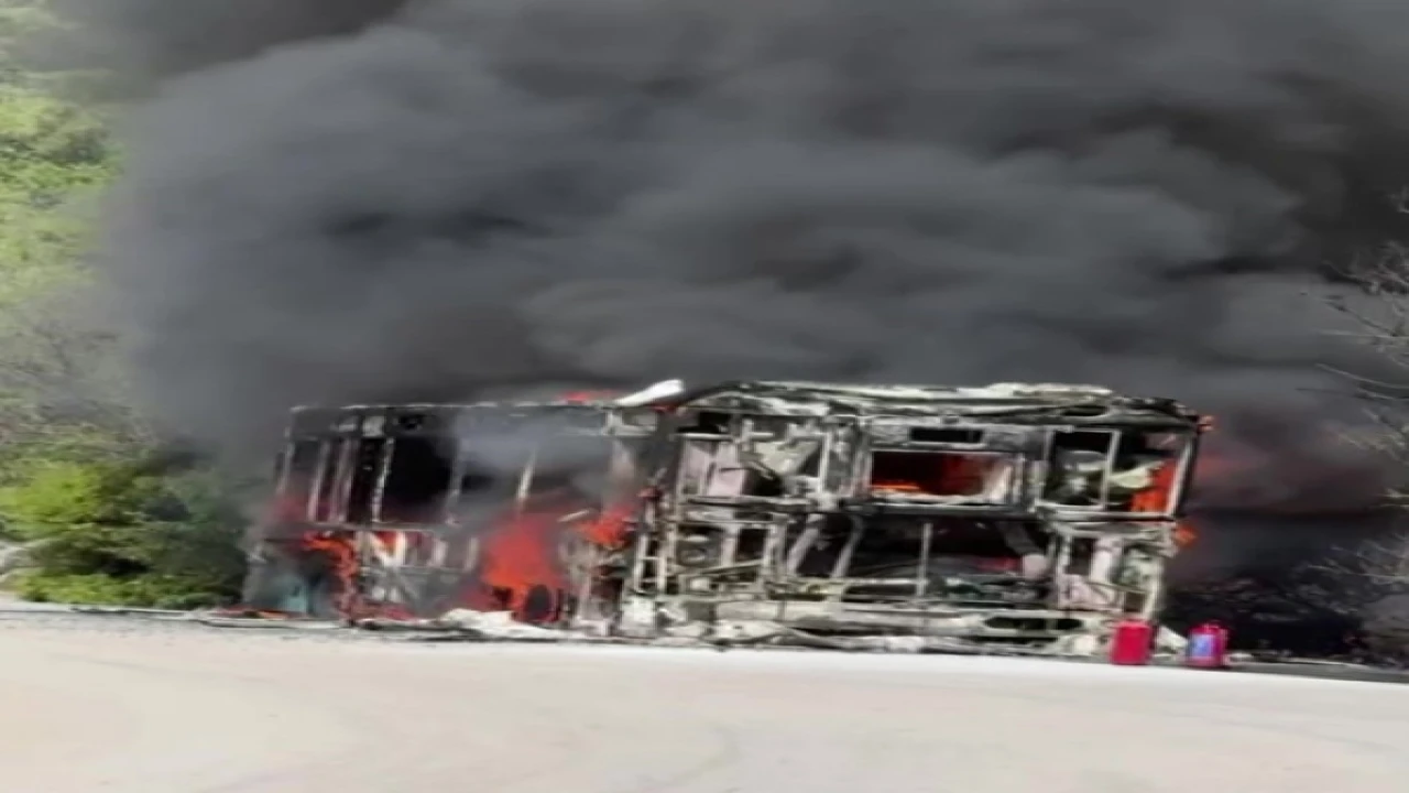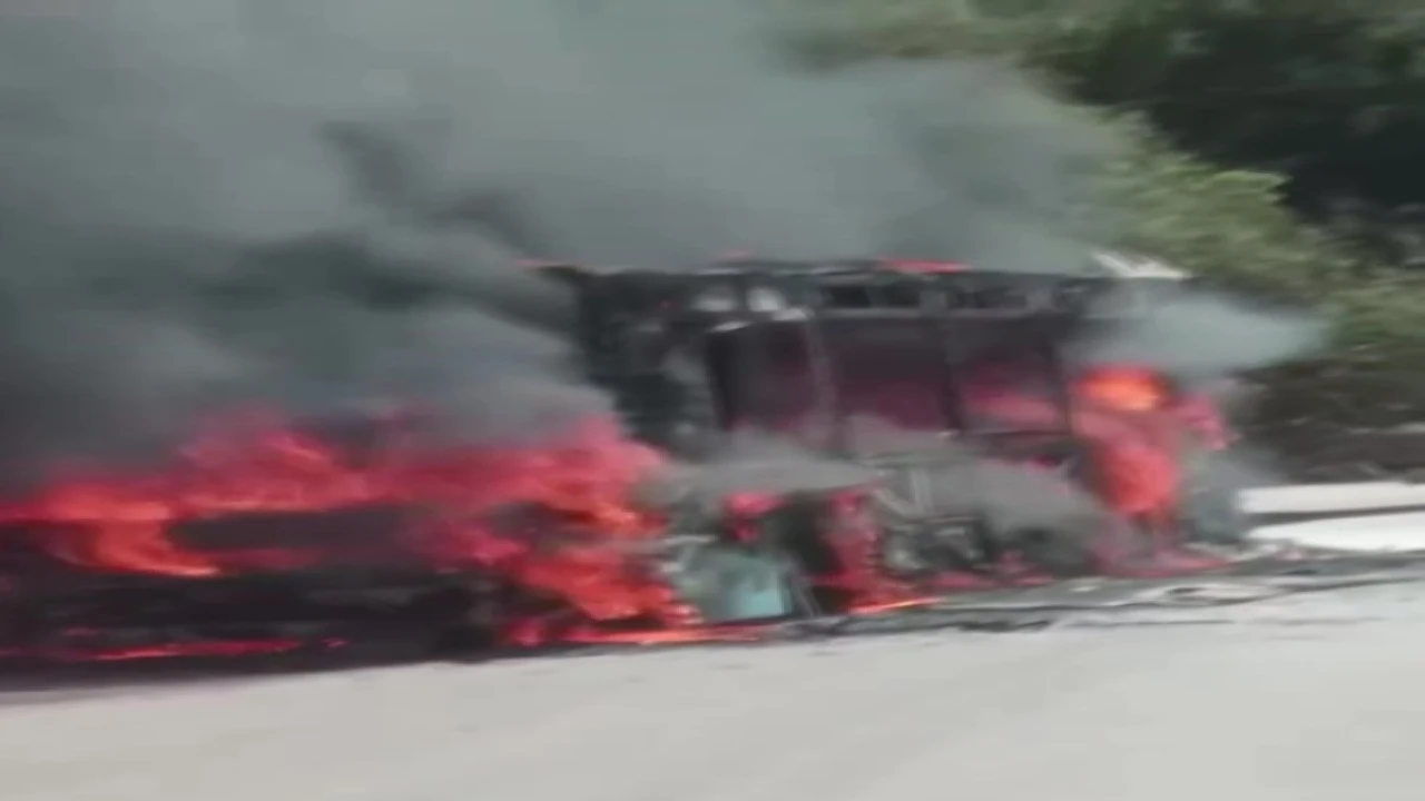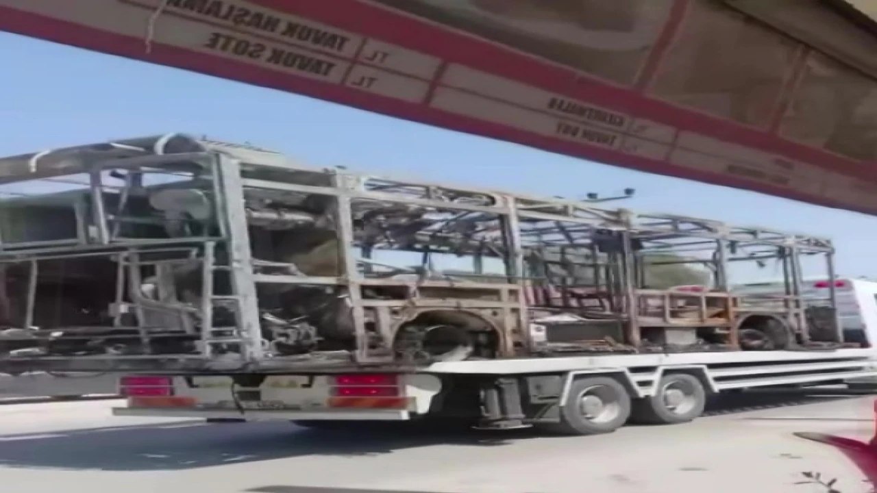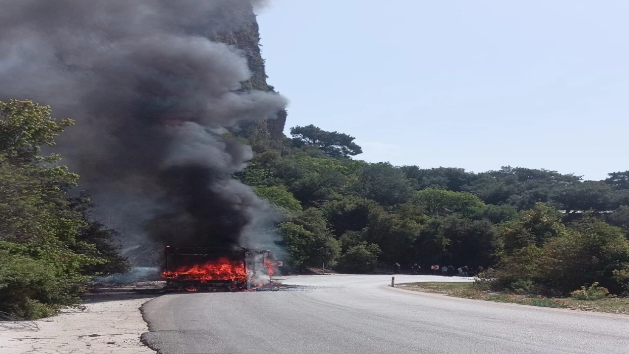 ANTALYA’DA SEYİR HALİNDEKİ HALK OTOBÜSÜ ALEVLERE TESLİM OLDU. YANGIN SONRASI HALK OTOBÜSÜNDEN GERİYE DEMİR YIĞINI KALDI.
