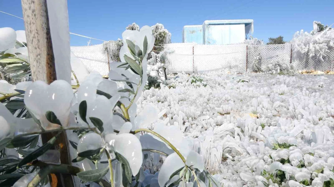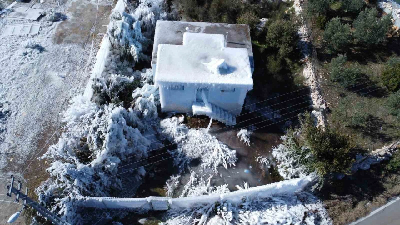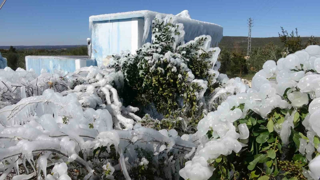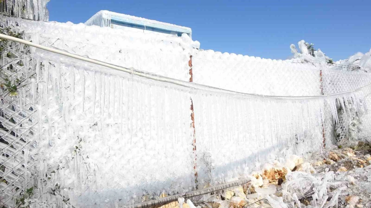 Sibirya soğukları ülke genelinde olduğu gibi Mersin’de de etkili olmaya başladı. Yaz şehri olarak bilinen Mersin’de 500 rakım üzerindeki yerleşim yerleri bu kış ilk defa eksileri gördü. Erdemli ilçesine bağlı kırsal mahallelerden Karahmetli’de de soğuk hava ve rüzgar gece boyunca etkili oldu. Eksi 3 dereceye kadar sıcaklığın düşmesi, tarım alanında kullanılan sulama borularından birinde çatlak meydana gelmesiyle ilginç bir görüntü de oluşturdu. Çatlak borudan fışkıran su, mahallenin içme suyunu tedarik eden deposuyla çevresini dondurdu. Ortaya buzulları hatırlatan görüntüler çıktı. Durumu gören yöre sakinleri de bölgeye gelerek ilginç manzaranın fotoğraflarını çekti.