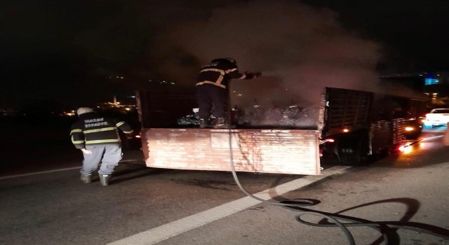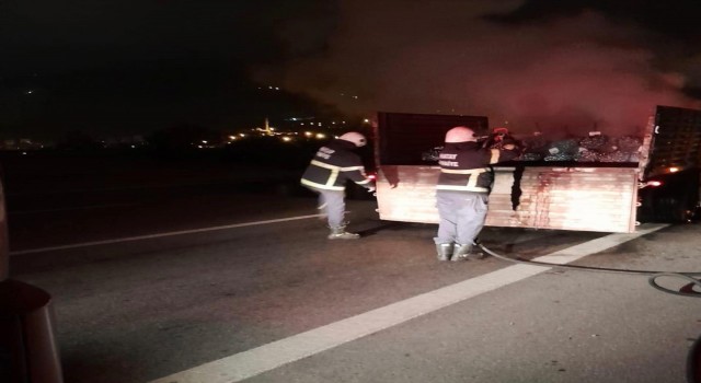 Hatay’da sıcak demir yüklü tırın dorsesinde yaşanan yangını itfaiye ekipleri söndürdü.