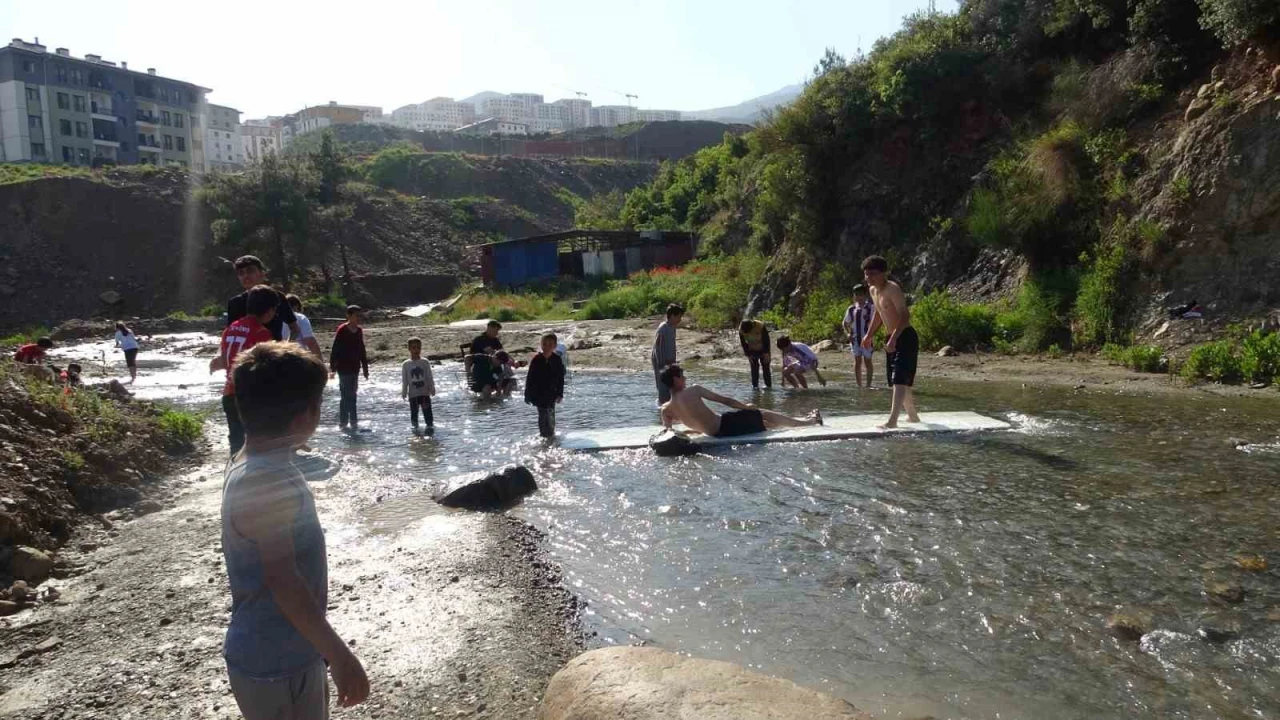 Antakya ilçesi Gülderen Mahallesi'nde sıcak havada bunalan çocuklar derede yüzerek serinlediler.