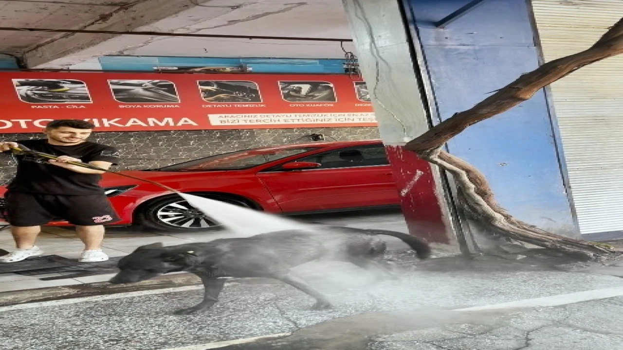 ANTALYA’DA SICAKLARDAN BUNALAN BİR KÖPEK, SANAYİDEKİ OTO YIKAMACIYA GELİP HER İKİ SAATTE BİR SERİNLİYOR. ARAÇLARI YIKADIKLARI SIRADA KÖPEĞİ DE SERİNLETEN ÇALIŞANLARIN GÖRÜNTÜSÜ İZLEYENLERİ TEBESSÜM ETTİRİYOR.