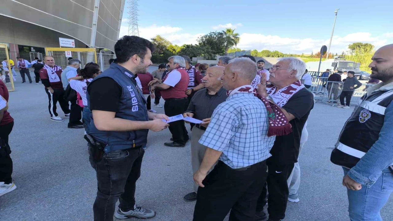Ayrıca, TEM Şube Müdürlüğü ekiplerince yine Hatayspor ile Eyüpspor arasında oynanan müsabakaya katılan vatandaşlara terör örgütleri, bu örgütlerin uzantıları, terörün özellikle gençler üzerindeki olumsuz etkileri, eleman kazanma yöntemleri ile ailelerin tutum ve davranışlarının önemi hakkında bilgiler verildi ve broşürler dağıtıldı.