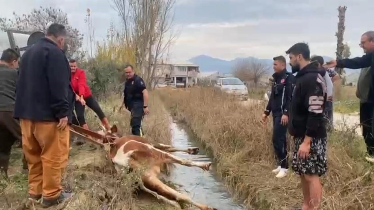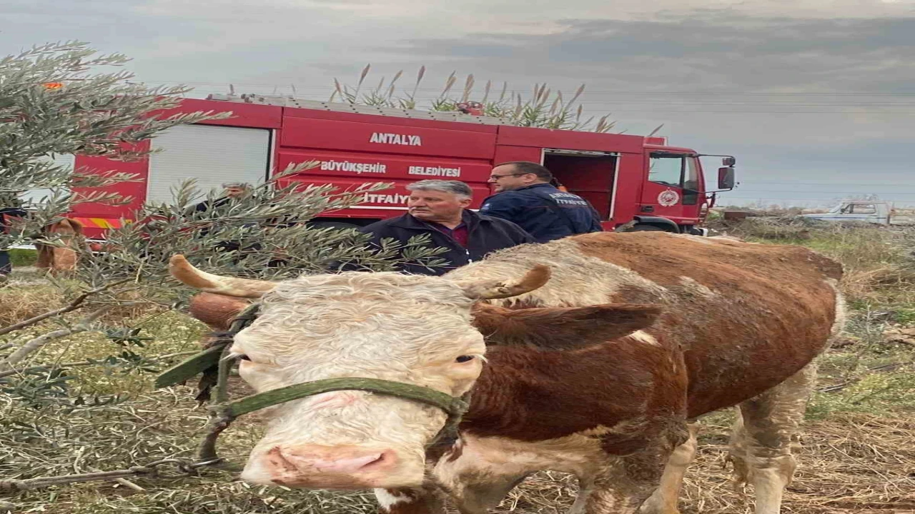 Olay, Serik’e bağlı Karıncalı Mahallesi’nde meydana geldi. Edinilen bilgiye göre, arazide otlarken sulama kanalına düşen ineği fark eden vatandaşlar durumu itfaiyeye bildirdi. İhbarla bölgeye gelen Antalya Büyükşehir Belediylesi Serik İtfaiye birimi ekibi vatandaşların da desteğiyle halatla ineği bulunduğu yerden çıkardı.