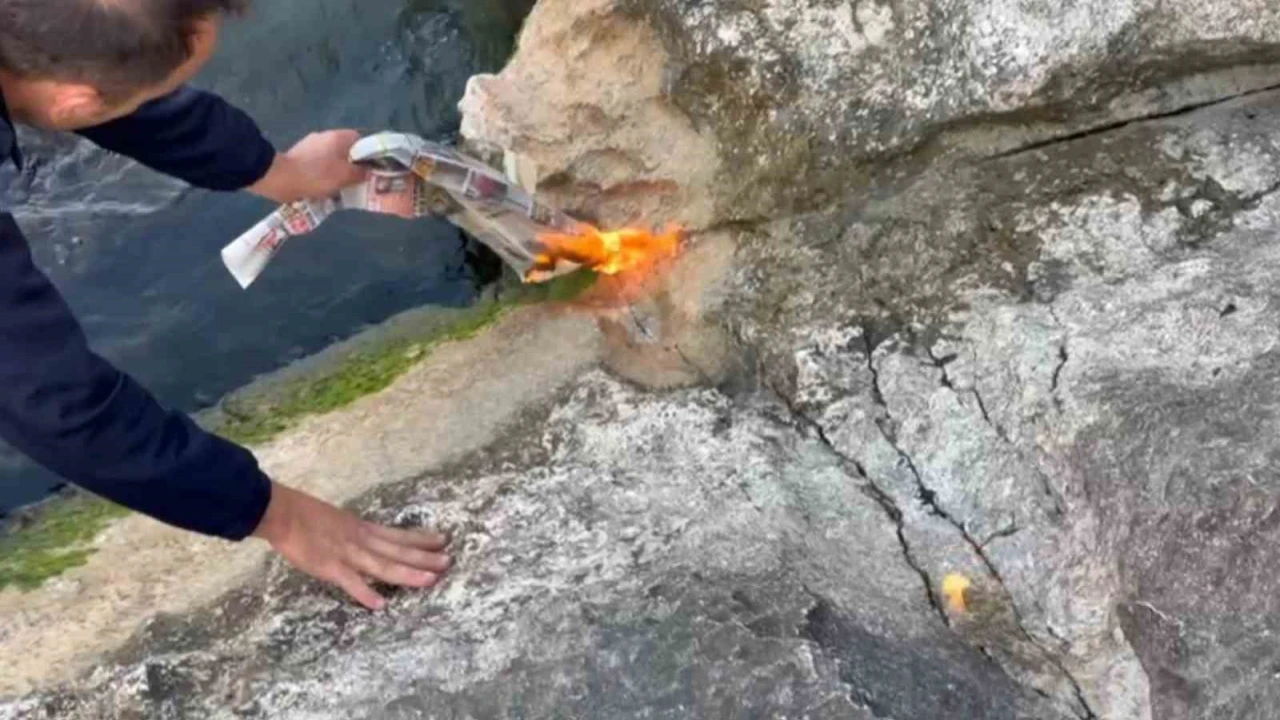 EĞİRDİR GÖLÜ’NDE SULARIN ÇEKİLMESİYLE AÇIĞA ÇIKAN KAYALIK BÖLGEDE BİR VATANDAŞIN ÇAKMAĞINI ÇAKMASIYLA KAYALIKLARIN ALEV ALMASI GÖRENLERİ ŞAŞIRTTI.