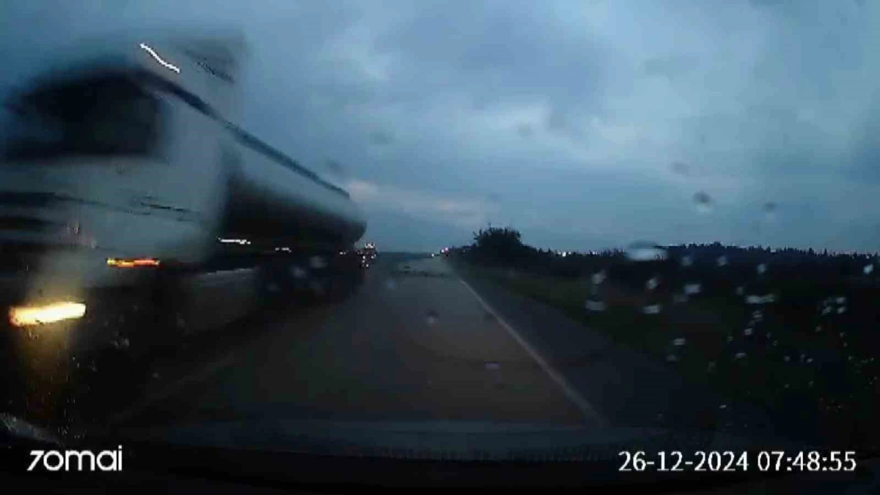 HATAY’DA BİR SÜRÜCÜ, TRAFİKTE SEYİR HALİNDEYKEN KARŞIDAN GELEN SÜRÜCÜNÜN KULLANDIĞI YAKIT TANKI KORKU DOLU ANLAR YAŞATTI. O ANLAR İSE ARAÇ KAMERASINA YANSIDI.