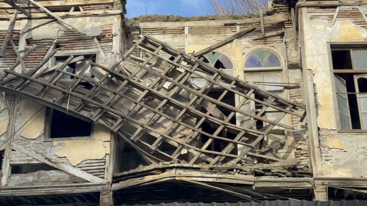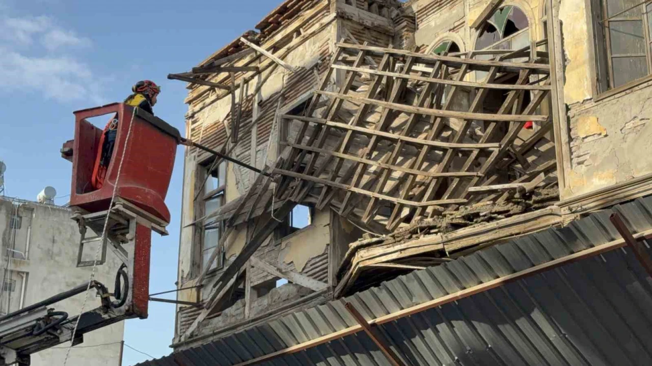 Adana’da tarihi bir binanın çatısı kısmen çökerken ekipler çevrede güvenlik önlemi alıp çöken çatıdaki tahtaları kesti.
