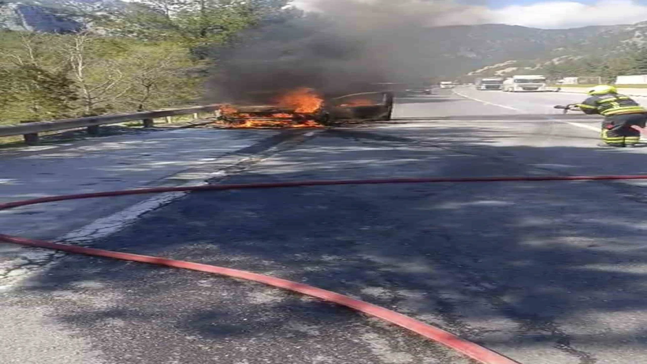 Mersin’in Tarsus ilçesinde, Pozantı-Adana istikameti Gülek Tüneli çıkışında seyir halindeki bir araç alev alev yandı.