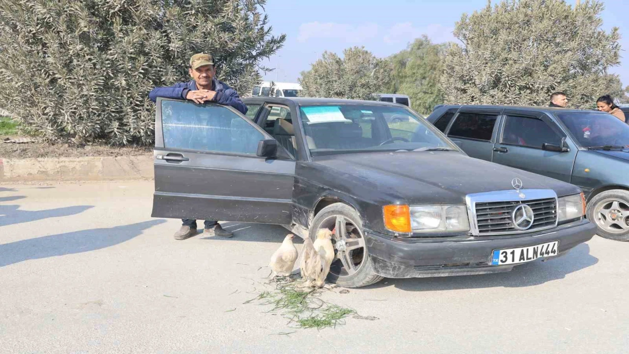 HATAY’DA HER HAFTA KURULAN ARABA PAZARINA GELEN VE YILLARDIR KEPÇE OPERATÖRLÜĞÜ YAPAN MEHMET KUYUCU, HOBİ OLARAK BESLEDİĞİ TAVUK İLE HOROZU 1996 MODEL ARABASINI PAZARDA ALICI BEKLİYOR. ARABA PAZARINA İLK DEFA TAVUK İLE HOROZU GETİREN KUYUCU, TAVUK İLE HOROZA 3 BİN TL ARABAYA İSE 260 BİN TL’DEN MÜŞTERİ BEKLİYOR.