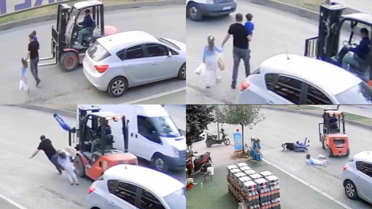 Bir iş yerinin güvenlik kamerasına saniye saniye yansıyan görüntülerde ters şeritten forkliftin gelerek baba ve çocuklarına çarptığı anlar yer aldı.