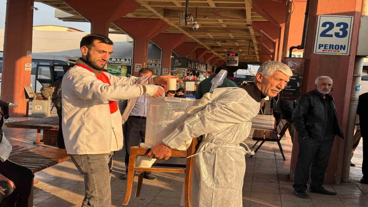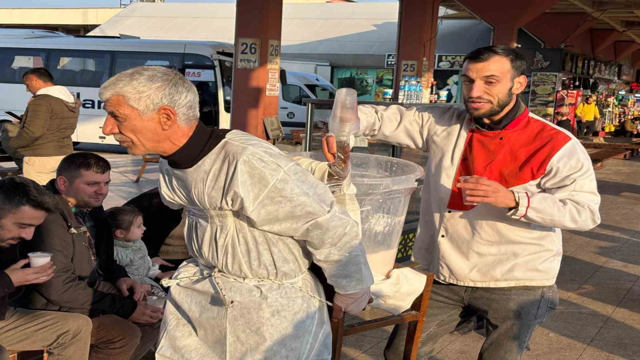 Adana’da otogarda seyyar tezgahta ayran satan ve "Yılancı Osman" olarak bilinen şahıs, tezgahına el konulduğu için ayranı sırtında taşıdığı kova ile satıyor.