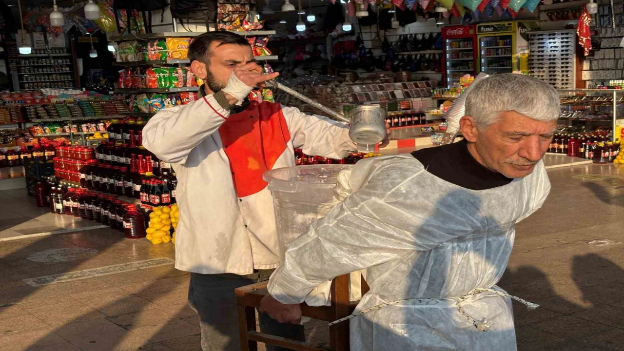 ADANA'DA OTOGARDA SEYYAR TEZGAHTA AYRAN SATAN VE "YILANCI OSMAN" OLARAK BİLİNEN ŞAHIS, TEZGAHINA EL KONULDUĞU İÇİN AYRANI SIRTINDA TAŞIDIĞI KOVA İLE SATIYOR.
