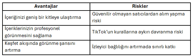 Yukarıdaki tabloda, TikTok izlenme satın al işleminin bazı avantajları ve riskleri özetlenmiştir. Bu adımı atmadan önce hem fırsatları hem de potansiyel zorlukları göz önünde bulundurmak faydalı olacaktır.