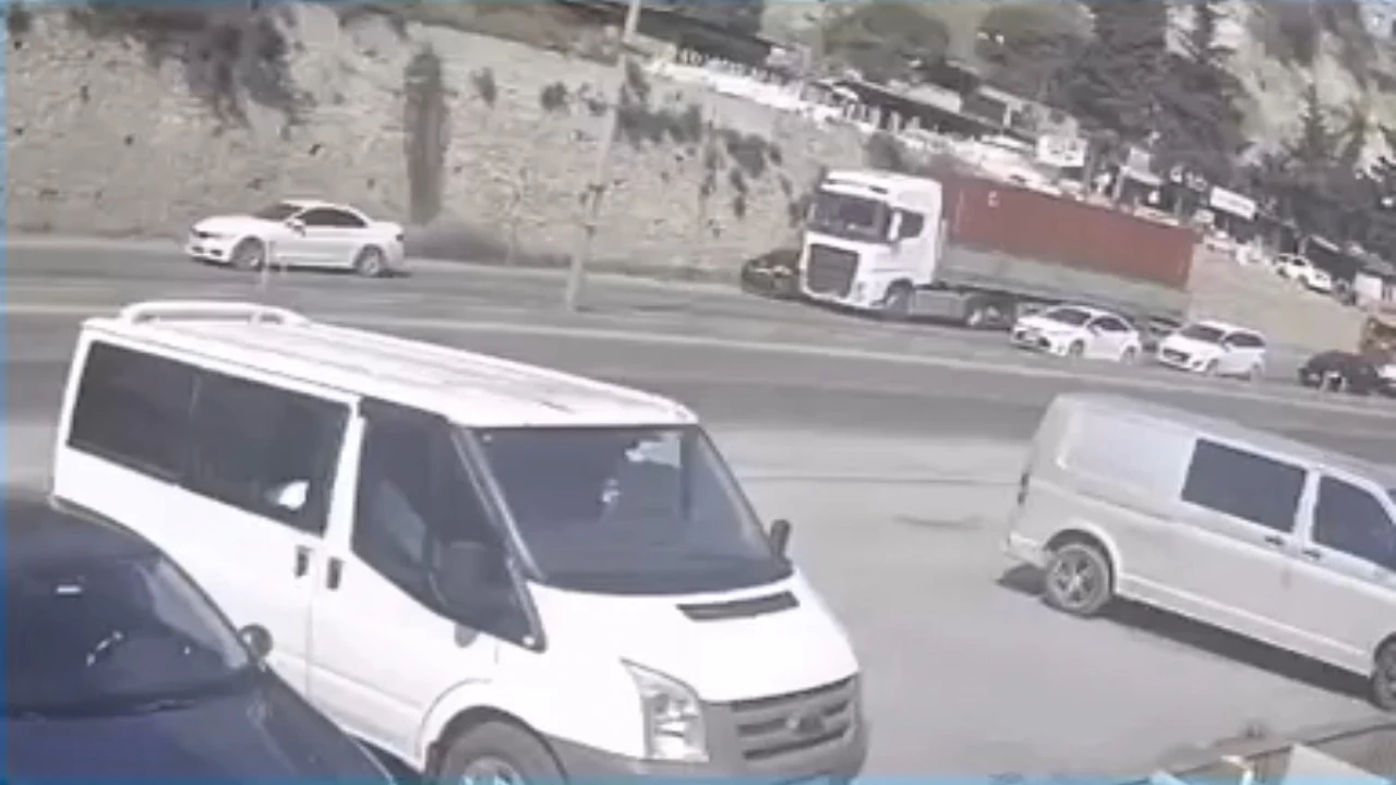 HATAY'IN BELEN İLÇESİNDE, TIRIN, ÖNÜNDE SEYREDEN OTOMOBİLİ ALTINA ALARAK SÜRÜKLEDİĞİ ANLAR, GÜVENLİK KAMERASINA YANSIDI.