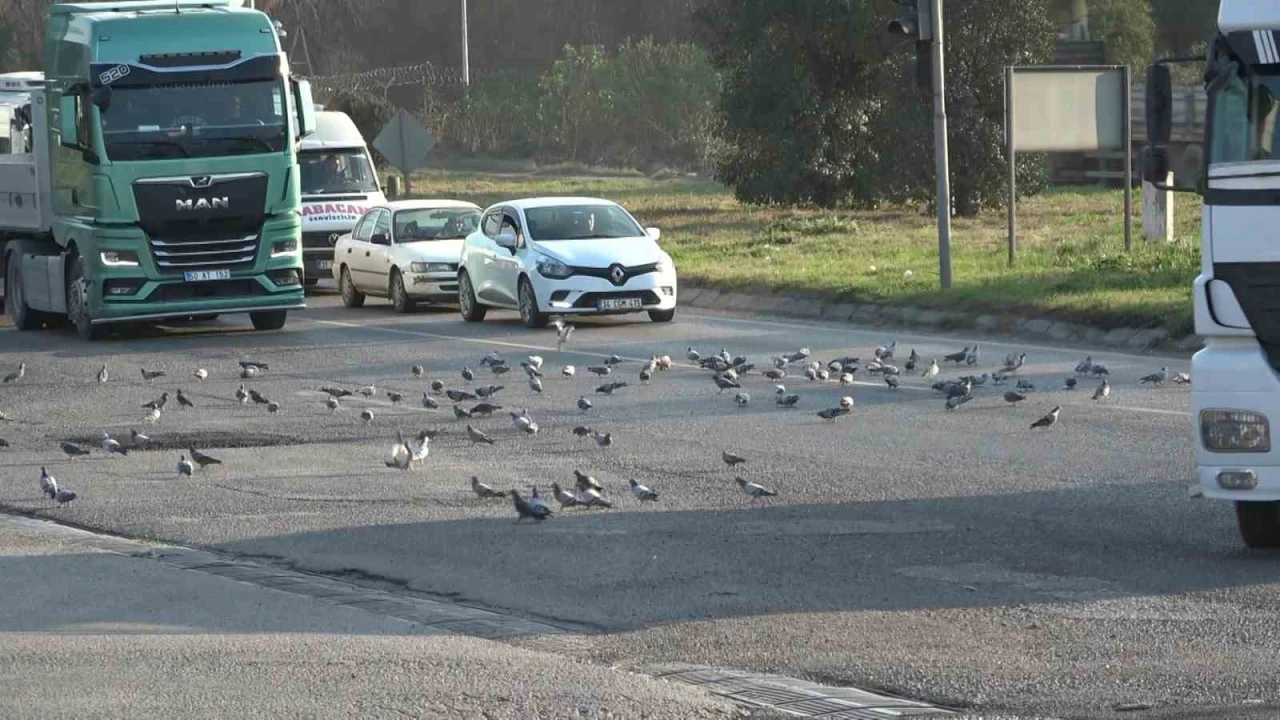 Tır sürücüleri tarafından 'güvercinli kavşak' olarak da bilinen bölgede vatandaşlar, kuşlara zarar vermemek adına duyarlı davranıyor.