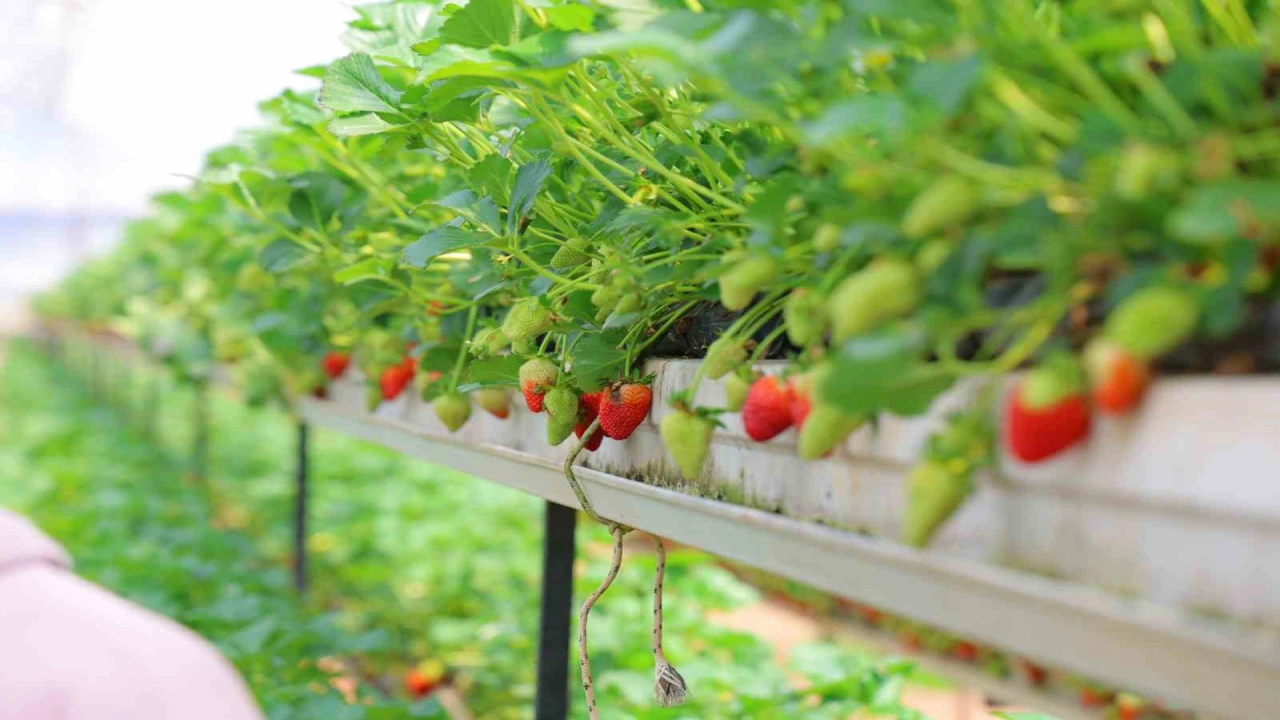 KAHRAMANMARAŞ'TA KURULAN MODERN SERADA TOPRAKSIZ TARIM YÖNTEMİYLE YETİŞTİRİLEN ÇİLEKLER, VATANDAŞLARIN DALINDAN TOPLADIĞI TAZELİĞİYLE BÜYÜK İLGİ GÖRÜYOR.