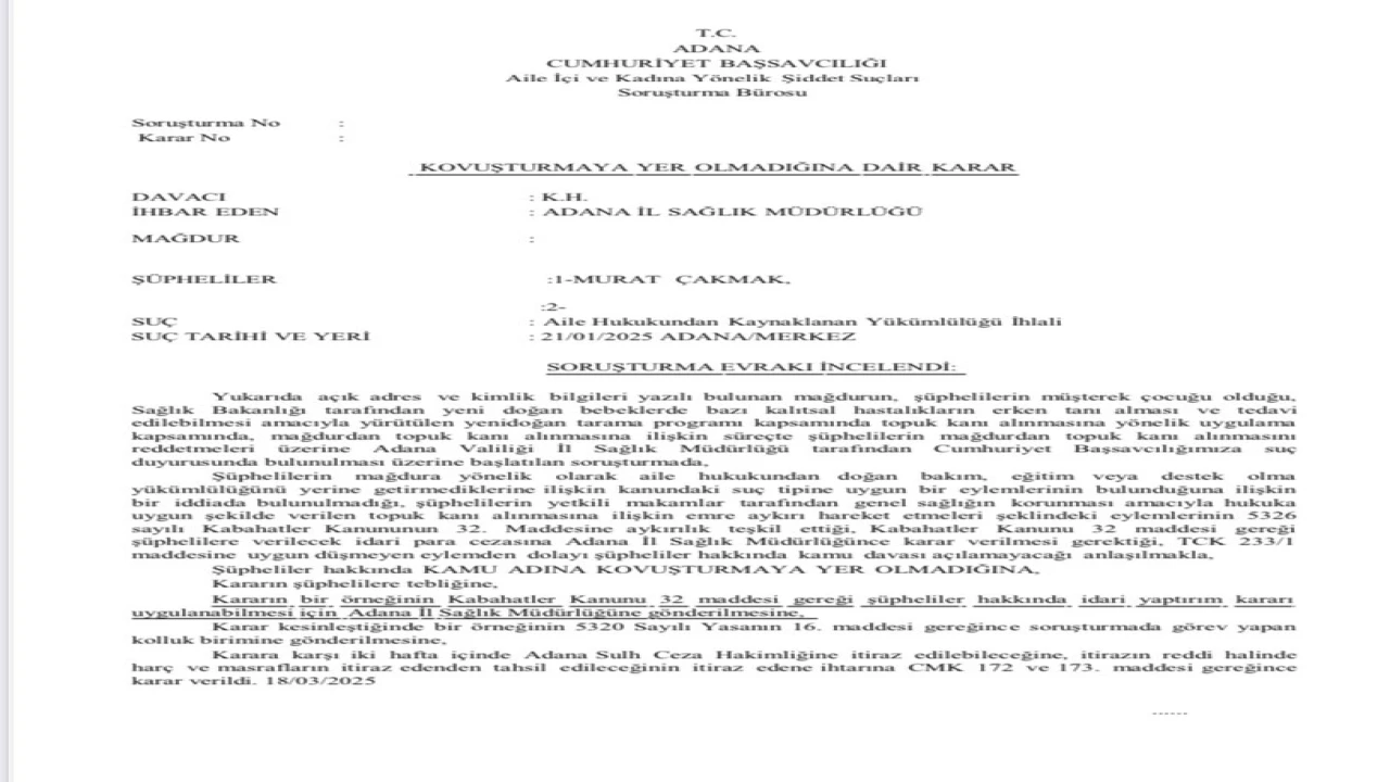 ADANA’DA DÜNYAYA GELEN BEBEKLERİNDEN TOPUK KANI ALDIRMADIKLARI İÇİN DAVA AÇILAN VE 2.5 AYLIK BEBEKLERİNE KAYYUM ATANAN AİLENİN İTİRAZI KABUL EDİLDİ. YÜRÜTÜLEN SORUŞTURMADA NETİCESİNDE TAKİPSİZLİĞİNE KARAR VERİLDİ.