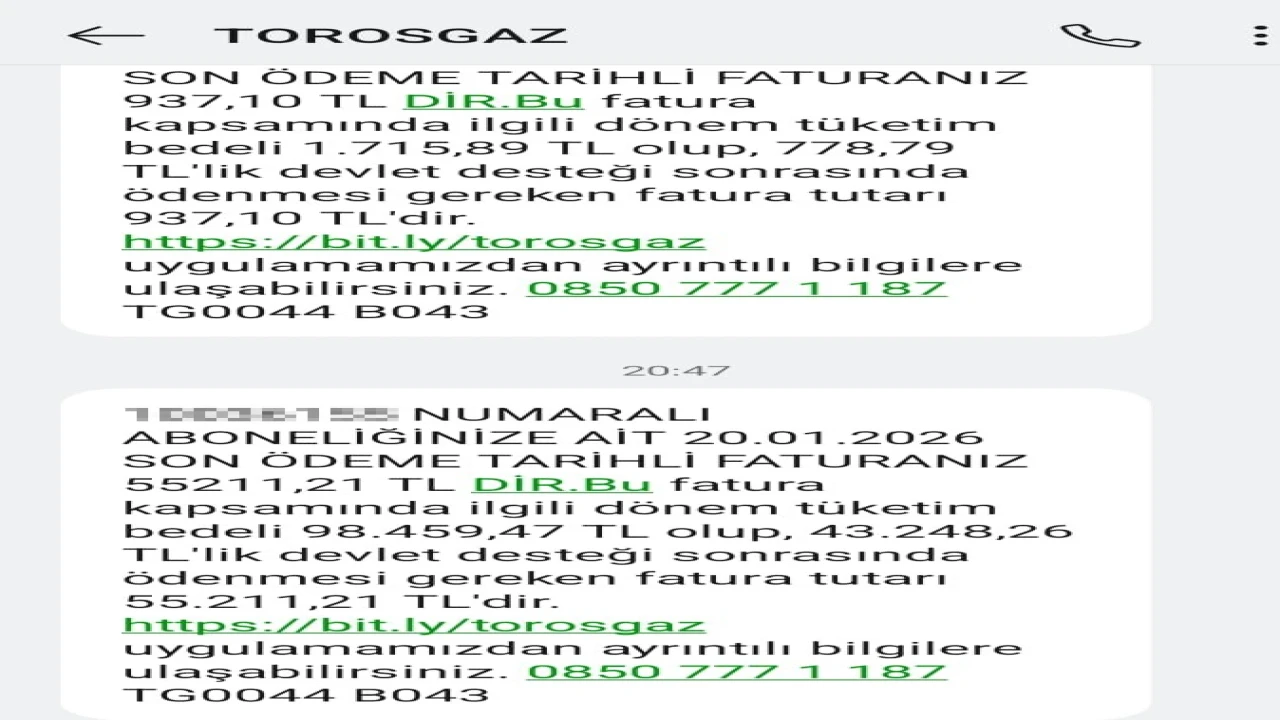 "Ben meseleyi takip etmeye devam ettim ve Torosgaz firması bu hatadan döndüğünü açıkladı" diyen Yıldızhan, "Ancak otomatik ödeme talimatım olduğu için eğer bu mesajı fark etmeseydim, 55 bin liralık fatura bankam tarafından otomatik olarak ödenecekti. Bu hatanın personelden mi kaynaklandığı yoksa firmanın bu süreci yeterince kontrol etmemesi mi olduğu belirsiz, ancak ortada ciddi bir denetim ve liyakat sorunu olduğu görülüyor. Vatandaşın hakkını korumayan, gerekli kontrolleri yapmayan bir yaklaşım var. Evin içinde zaten tasarruf etmek için kombi derecesini düşürmüş, daha kalın giyinerek oturuyorduk. Buna rağmen böyle bir rakamın çıkması gerçekten bizi derinden etkiledi" ifadelerini kullandı.