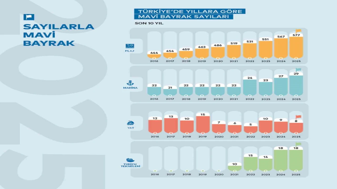 2024’te 567 olan Mavi Bayraklı plaj sayısı, bu yıl 577’ye yükseldi. Marina sayısı 27’den 29’a, bireysel yatlar ise 8’e çıktı. Mavi Bayrak Programı, dünya genelinde 50’den fazla ülkede uygulanıyor. Türkiye’de program, Türkiye Çevre Eğitim Vakfı (TÜRÇEV) koordinasyonunda; Kültür ve Turizm Bakanlığı, Çevre, Şehircilik ve İklim Değişikliği Bakanlığı ve Sağlık Bakanlığı iş birliğiyle yürütülüyor. Plajlarda 33, marinalarda 38, teknelerde 51 ve bireysel yatlarda 4 çevresel ve yönetsel kriterin sağlanması gereken program temiz çevre, güvenli yüzme alanları ve sürdürülebilir turizm anlayışıyla öne çıkıyor.