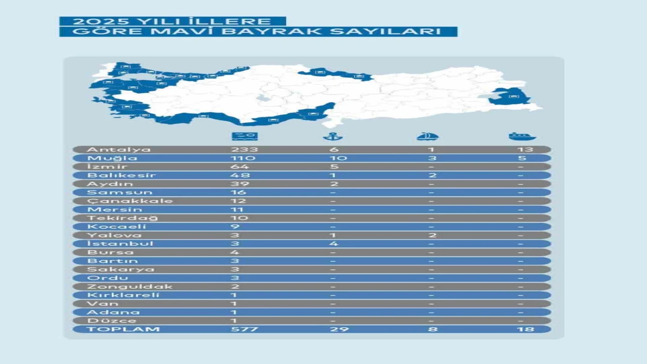 Türkiye, 577 plajla Mavi Bayraklı plaj sayısında dünyada üçüncü sıradaki yerini korurken, 233 plajıyla Antalya zirvede yer aldı. Akdeniz’in incisi, çevreci turizmde yine Türkiye’nin gururu oldu. Kültür ve Turizm Bakanı Mehmet Nuri Ersoy, "Mavi Bayrak ülkemize çok yakışıyor" diyerek başarıyı kutladı.
