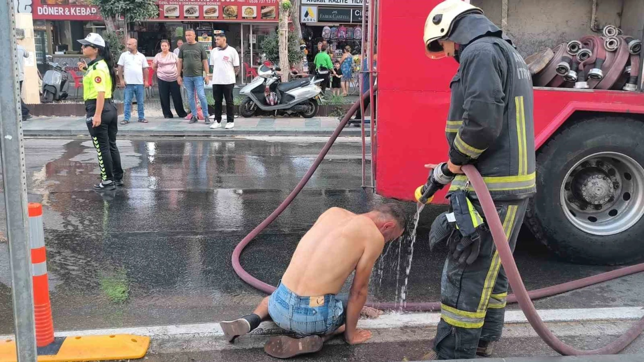 ANTALYA'DA ÜZERİNE BENZİN DÖKEREK KENDİSİNİ YAKACAĞINI SÖYLEYEN GENÇ, İTFAİYE EKİPLERİNİ ALARMA GEÇİRDİ. BAŞINDAN AŞAĞIYA DÖKTÜĞÜ BENZİN GÖZLERİNE KAÇINCA ACI ÇEKEN GENÇ, EYLEMİNDEN VAZGEÇTİ